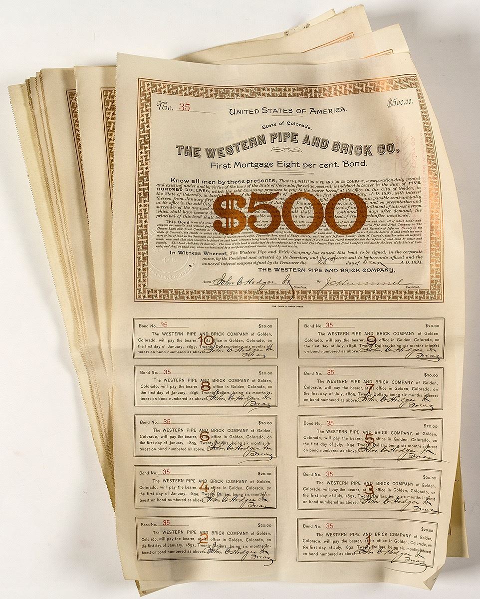 Lot of nine. earliest Number is 35 and latest is 52. Overall in good condition. Curls at upper right. Not do to water damage though. The Western Pipe & Brick Company, formed in Nov. 1891 to take advantage of the rich clay deposits in Golden, Colorado. The company had claims on the north side of Clear Creek and manufactured fire bricks, sewer bricks, and paving bricks with a capacity of 40,000 bricks per day. According to Clay Record Vol. 1 (1892), "all the most approved methods and the finest machinery have been introduced, and with an inexhaustible supply of material there is no limit to the possibilities of the concern." Signed by John C. Hummel (president) and John C. Hodges, Jr. (secretary). 10 coupons still attached to each. 16.5" x 11" with coupons. Folds and bent/rolled corners. Date: 1891 Location: Golden, Colorado HWAC# 44017