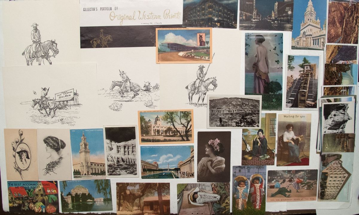 Four Western Sketches, 1959, by Charles Crouch in original folder. All of Cowboys and horseback, San Francisco, California. 45 unused post cards in various condition: two Indian papoose, three semi-nude ladies, Royal Gorge, Albany Hotel in Denver, Denver street scene, Red Rock Canyon RPCs, Los Angeles railroad terminal, sketches of ladies, train at Palisade Canyon in Nevada, Largest Ferry Boat in the World carrying railroad cars in California, etc. State: City: Date: FHWAC#: 2630