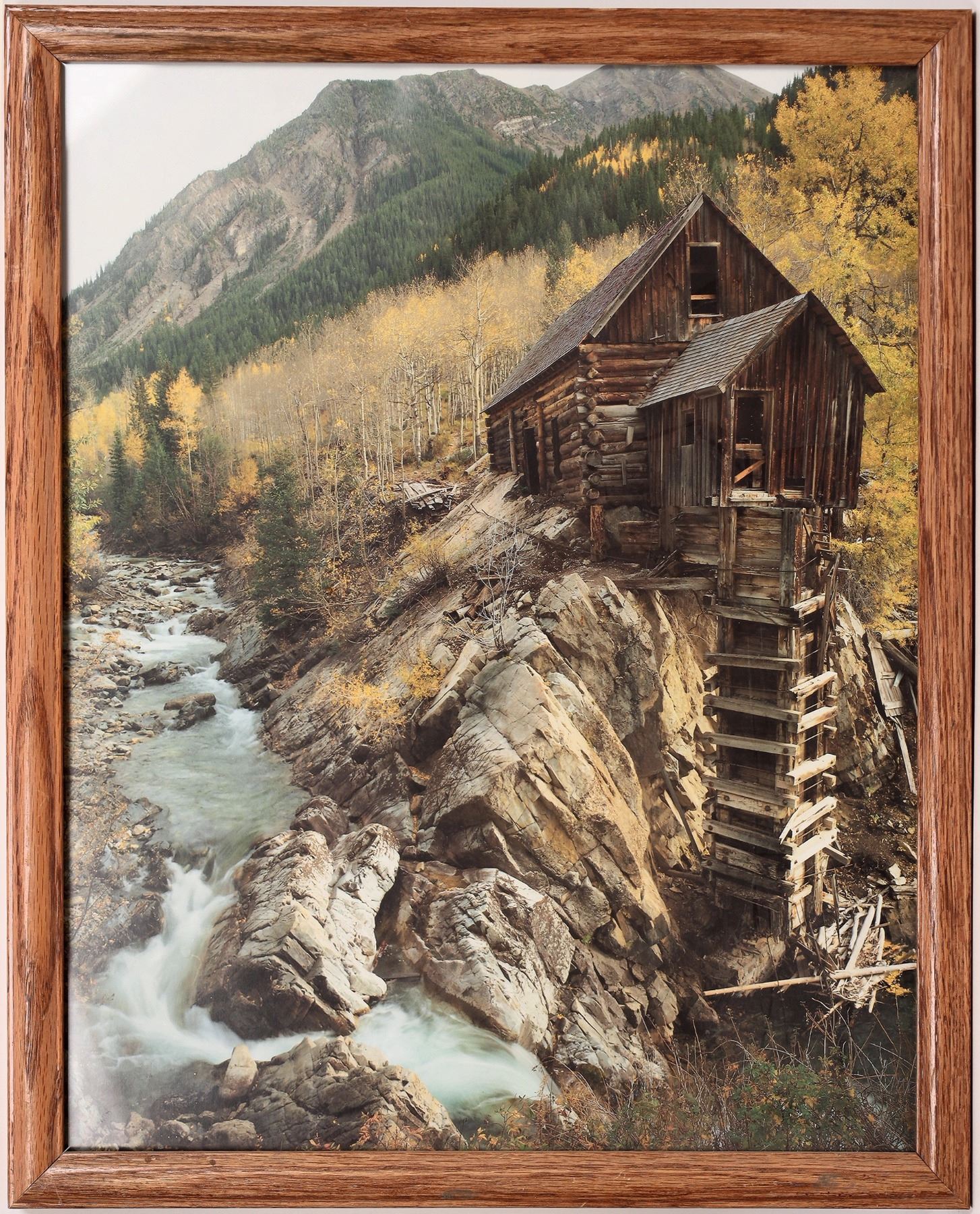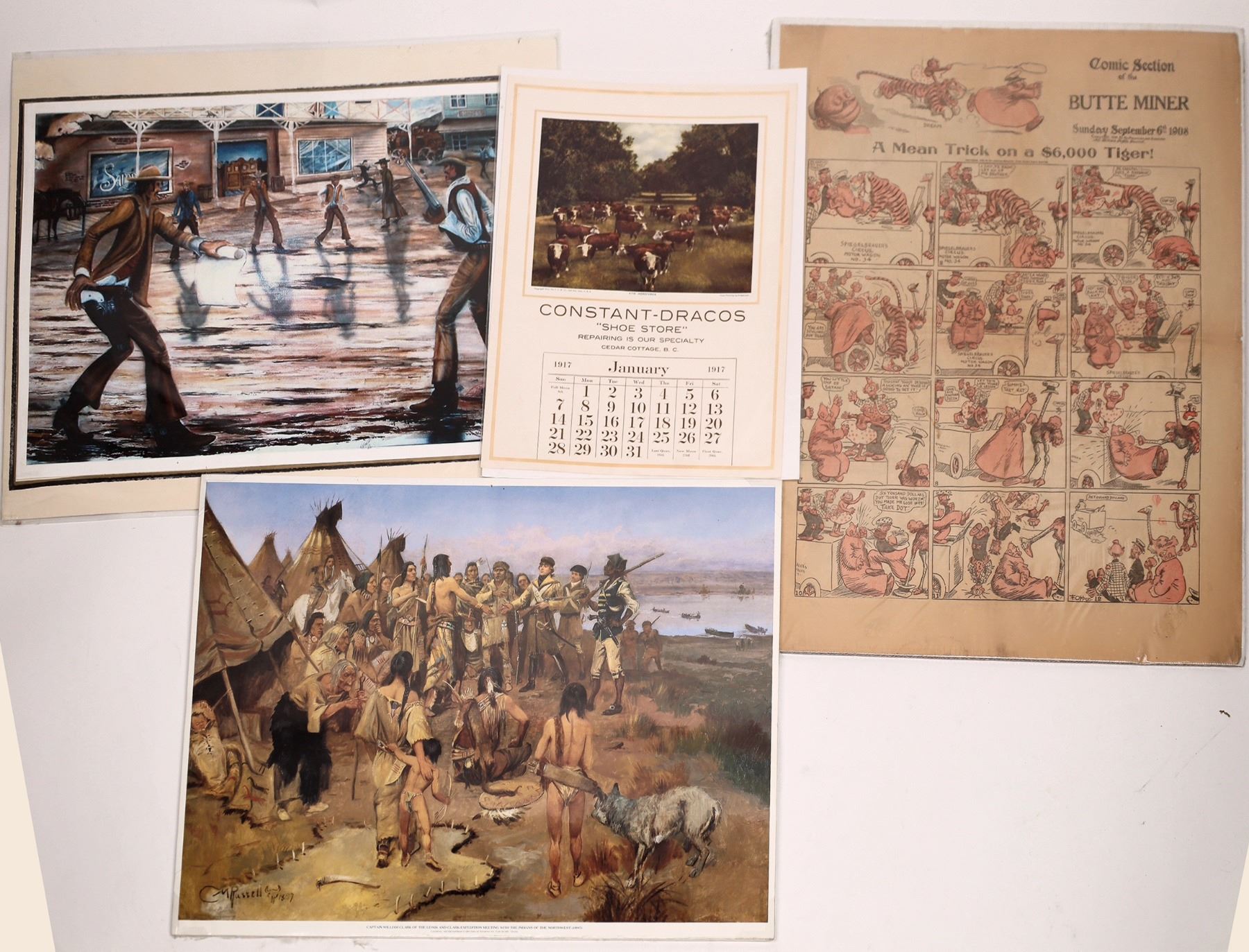 Lot of five different western art prints. These prints include a print of a cowboy painting by Tyrel Dowlat, a calendar print of cattle, a print of a painting of Lewis and Clark with a group of Native Americans, by Charles Russel, a print of a comic strip from the Butte Miner, and a framed photograph print of an log cabin structure by a creek. Various sizes, largest is 21.5 x 17.5, all good condition.