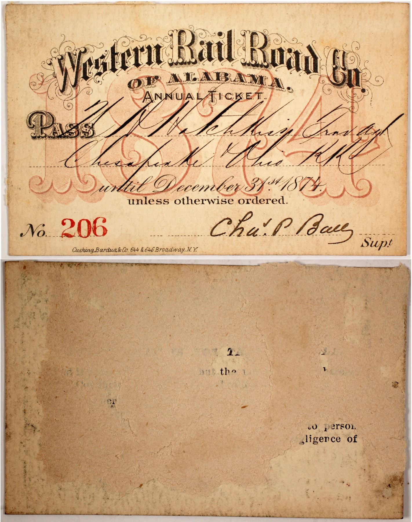 Pass No. 206, issued for 1874 to N.H. Hotchkiss, trav. agent for the Chesapeake & Ohio Railroad. Signed by Chas. O. Ball, superintendent. Black print, red underprint. Soiling to front of pass, reverse mostly covered by paper residue. Created as the Western Railroad of Alabama by the owners of the Montgomery & West Point Railroad (M&WP) in 1860. It was built to further the M&WP's development West from Montgomery, Alabama to Selma, Alabama. When the line was constructed in 1870, the M&WP was merged into the WRA, creating a line from Selma to West Point, Georgia. It served Auburn, Alabama and connected in Opelika, Alabama to the Central of Georgia line from Columbus, Georgia to Birmingham, Alabama. (Potter Collection)