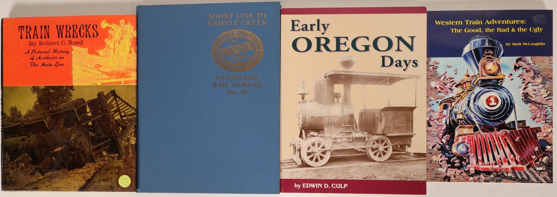 Lot of 4. 1) Short Line to Cripple Creek Colorado Rail Annual No. 16 w/ map. by Wilkins, 1983, hardcover. 2) Early Oregon Days by Edwin D. Culp, 1997, softcover. 3) Western Train Adventures: The Good, the Bad, & the Ugly. By Mark McLaughlin. 2003. Signed. Softcover. 4) Train Wrecks: A Pictorial History of Accidents on the Main Line. By Robert C. Reed. 1968. Hardcover with dustjacket.