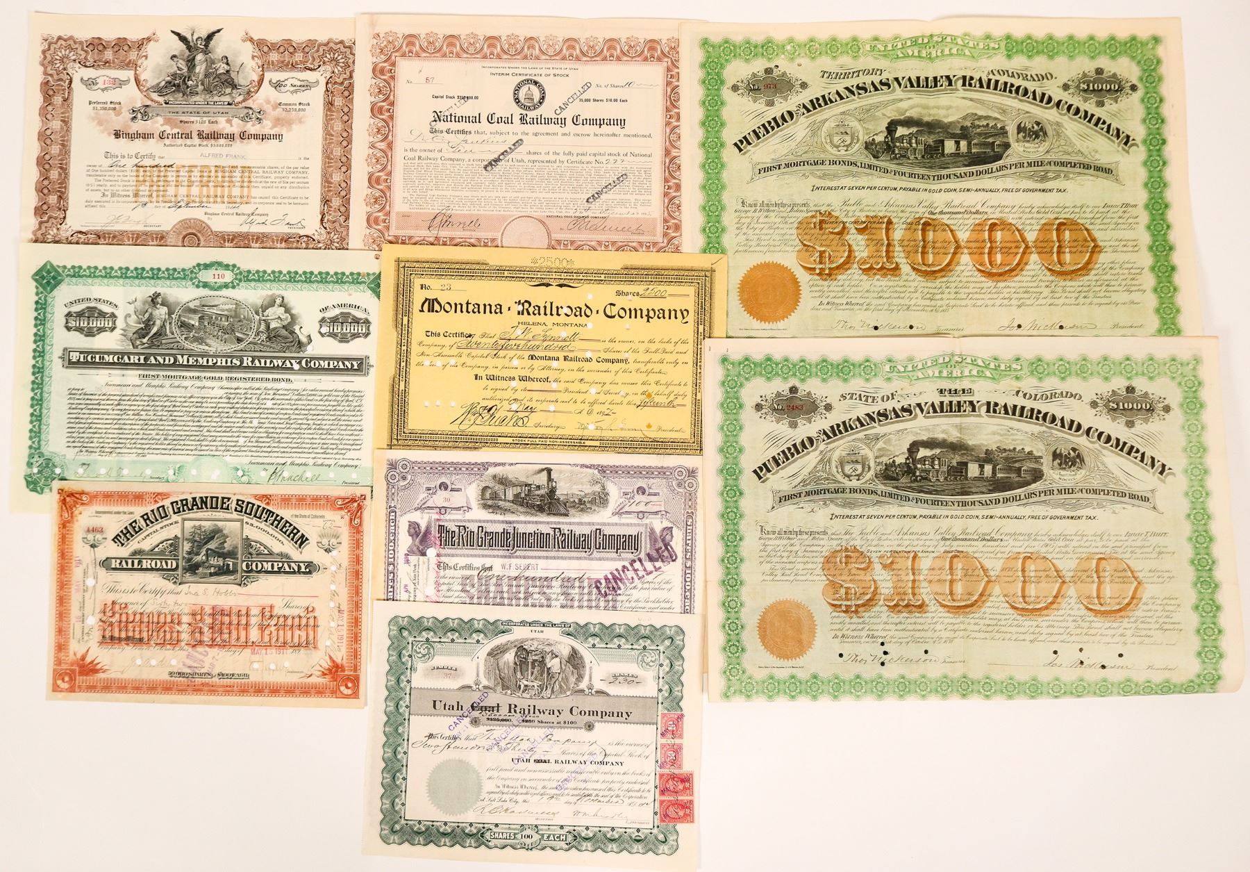 This group includes a $1,000 bond issued by The Pueblo & Arkansas Valley RR, dated 1905. It also includes stock certs from various railroads, including Montana RR Co., Bingham Central RR, National Coal RY Co., Utah Coal RY (With four transfer stamps affixed), Tucumcari & Memphis RY, The Rio Grande Junction RY and the Rio Grande Southern RR Company. All are in good condition. See photos for more detail.