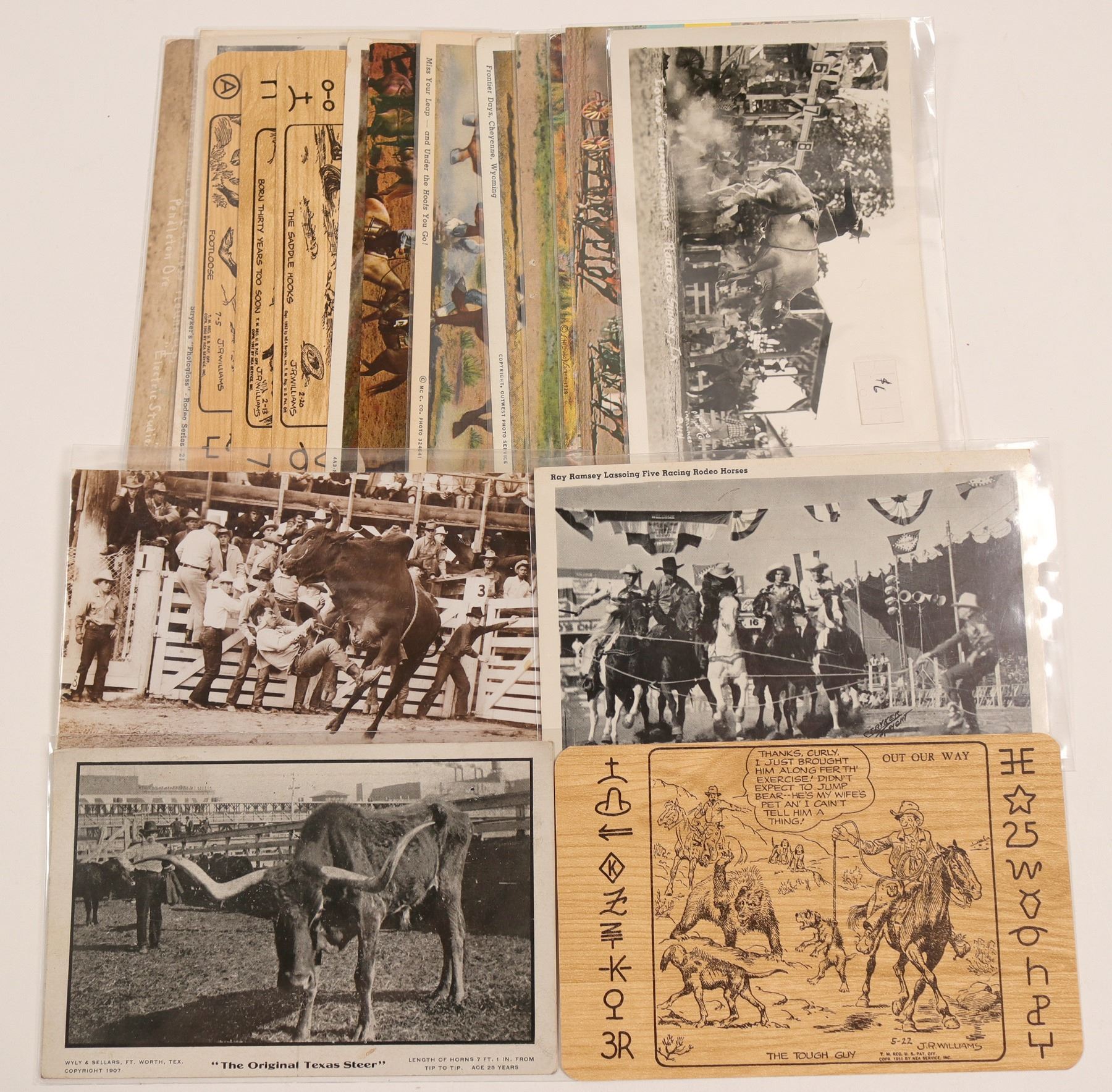 16 Western Rodeo-Related postcards. Three comic cards, 7 color cards and 6 black and white postcards. Postcards include Iowa's Championship Rodeo, Sidney, IA, "Original Texas Steer" and "Midnight, "World's Famous Bucking Horse Doing His Stuff."