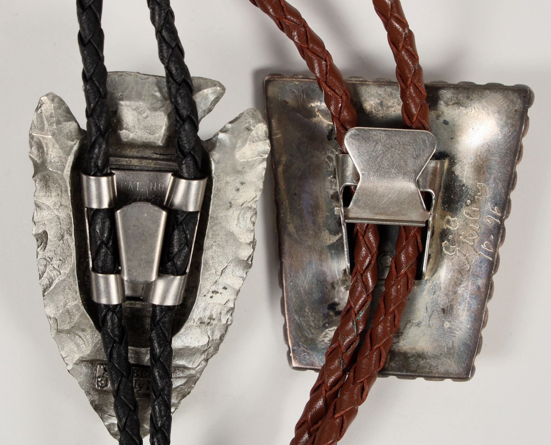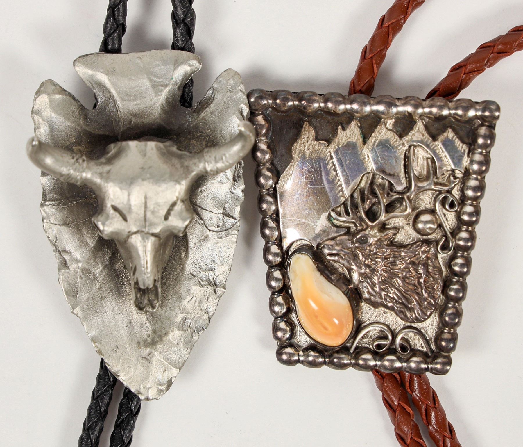 Lot of two: 1) Sterling bolo, elk head with elk tooth, mountain setting. Marked "G. B. Sterling" dated 10/96, brown leather. 2) Cow skull,, Sid Bell, Tully NY, black leather.