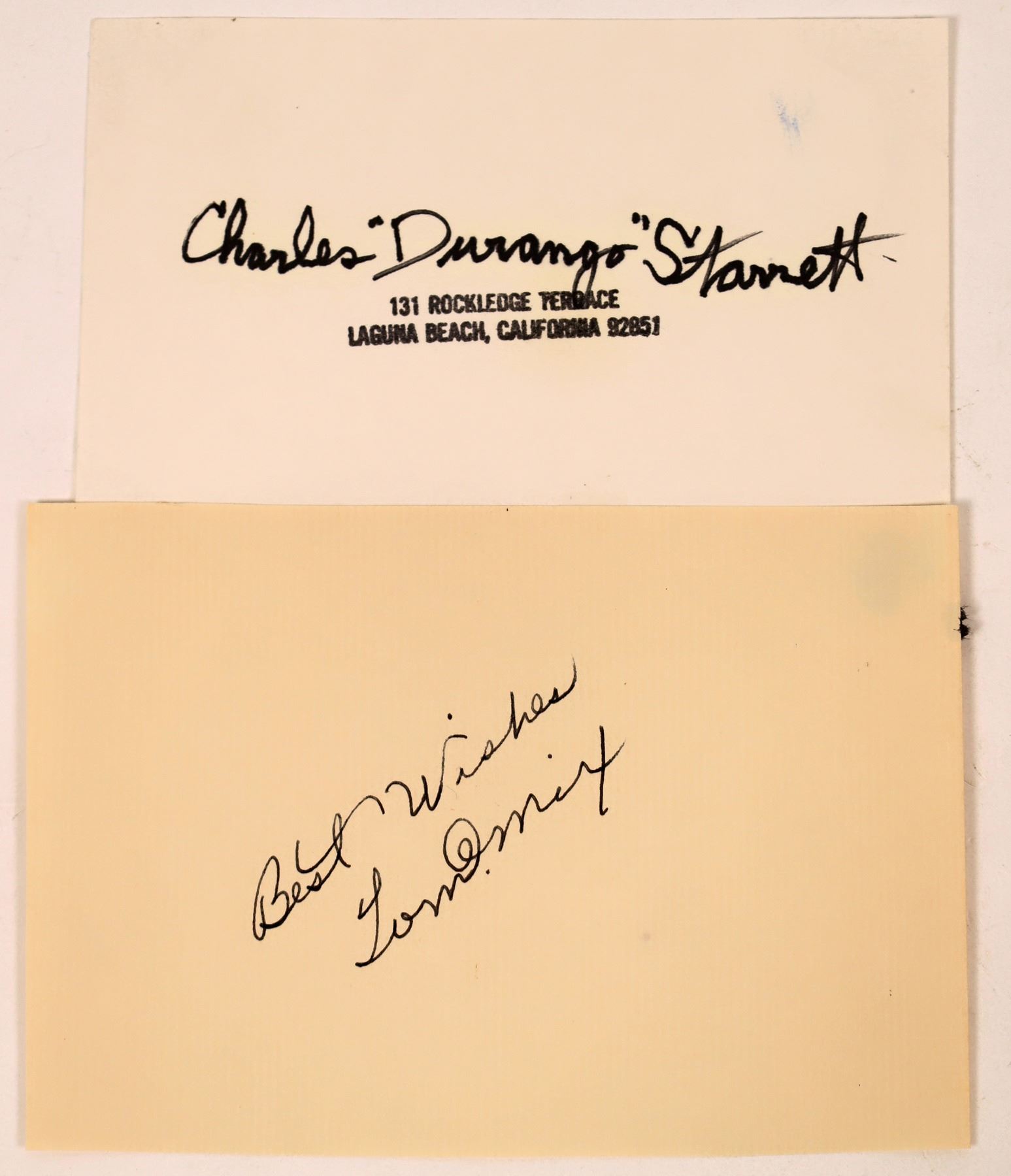 This is an autograph from one of my Dad's favorite cowboy stars, Tom Mix. An accomplished horseman from an early age, Mix was able to break into films in the early part of the 20th century, first as a wrangler then as an actor. Film producers, Selig Polyscope, retained him as an actor, and from 1911 to 1917 he appeared in over 100 one- and two-reelers, often producing and/or directing his films. Selig went out of business in 1917 and Mix was signed by Fox, which starred him in the westerns that established him as the premier cowboy star. Charles "Durango" Starrett (1903-1986) was also a cowboy star, but his career went from the 1930's to the early 1950's. Both signatures are clear. Please see photos for more detail and condition. State:California City:Hollywood Date:1900's Provenance: Salvatore Falcone Collection