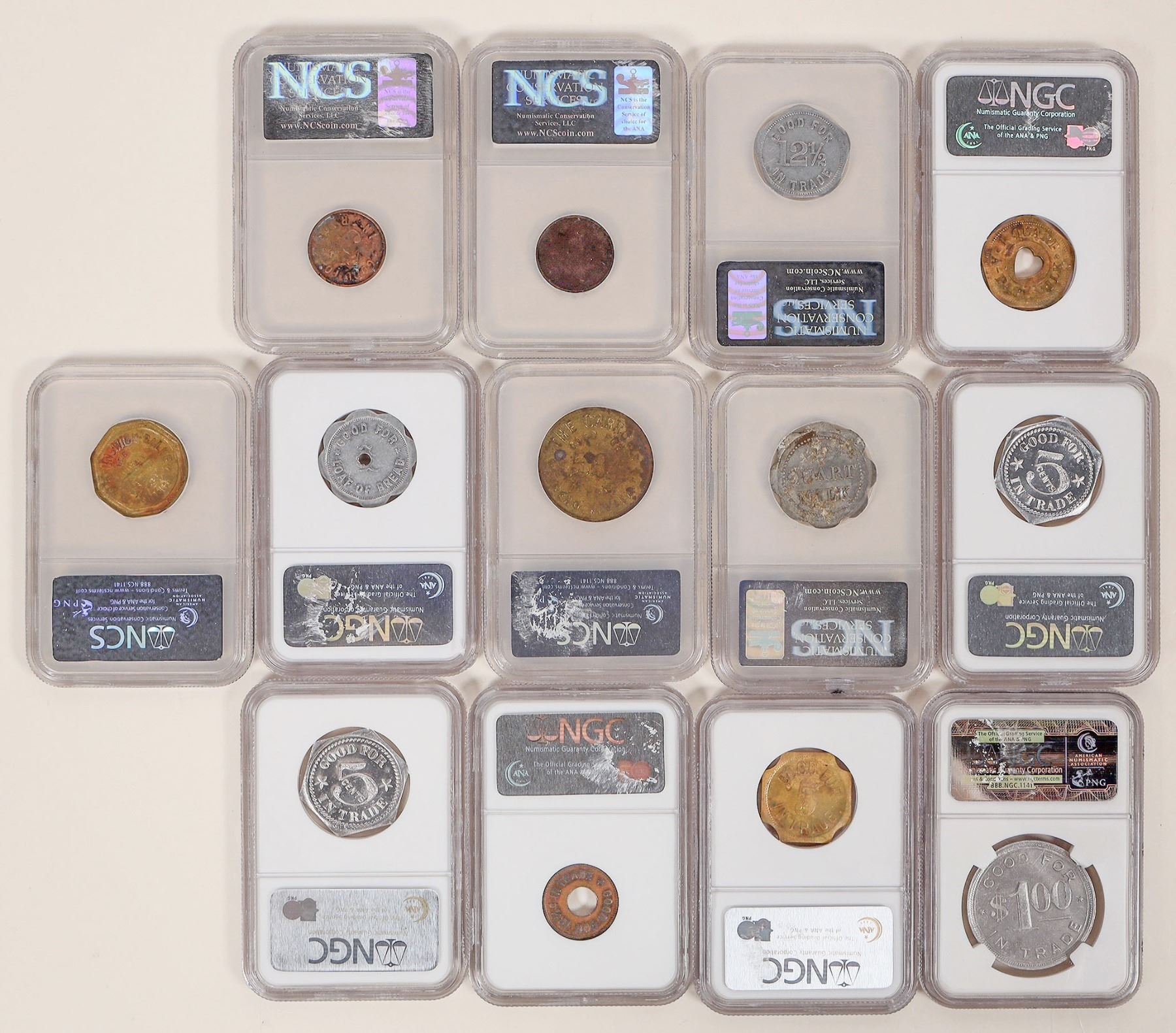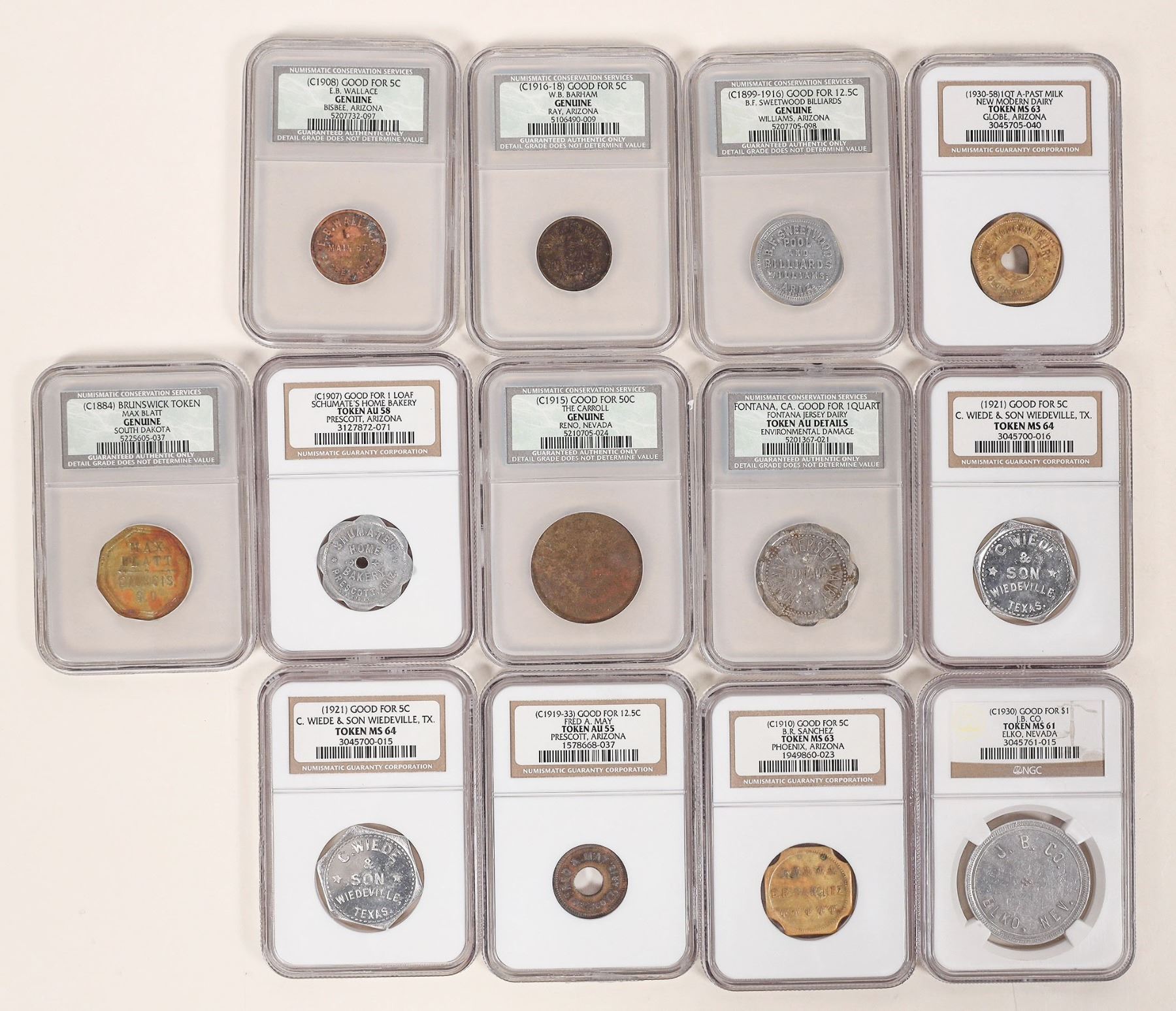 Bakers dozen! Good cross section of 13 Western States graded tokens, five uncirculated: 1 & 2) NGC MS 64: C. Wiede & Son, Wiedeville, Texas, GF 5c; 3) NGC MS 63: B. R. Sanchez, Phoenix, Arizona, GF 5c; 4) NGC MS 63: New Modern Dairy, Globe, Arizona, GF 1 At. A-past milk; 5) NGC MS 61: J. B. Co., Elko, Nevada, GF $1; 6) NGC AU 58: Schumate's Home Bakery, Prescott, Arizona, GF 1 loaf; 7) NGC AU 55: Fred A. May, Prescott, Arizona, GF 12.5c; 8) NCS Genuine: E. B. Wallace, Bisbee, AZ, GF 5c; 9) NCS Genuine: B. F. Sweetwood Billiards, Williams, AZ, GF 12.5c; 10) NCS Genuine: The Carroll, Reno, GF 50c; 11) NCS Genuine: Max Blatt, Sturgis, South Dakota, BBC billiard token; 12) NCS Genuine: W. B. Barham, Ray, GF 5c; 13) NCS Token AU Details environmental damage: Fontana Jersey Dairy, GF 1 Qt.