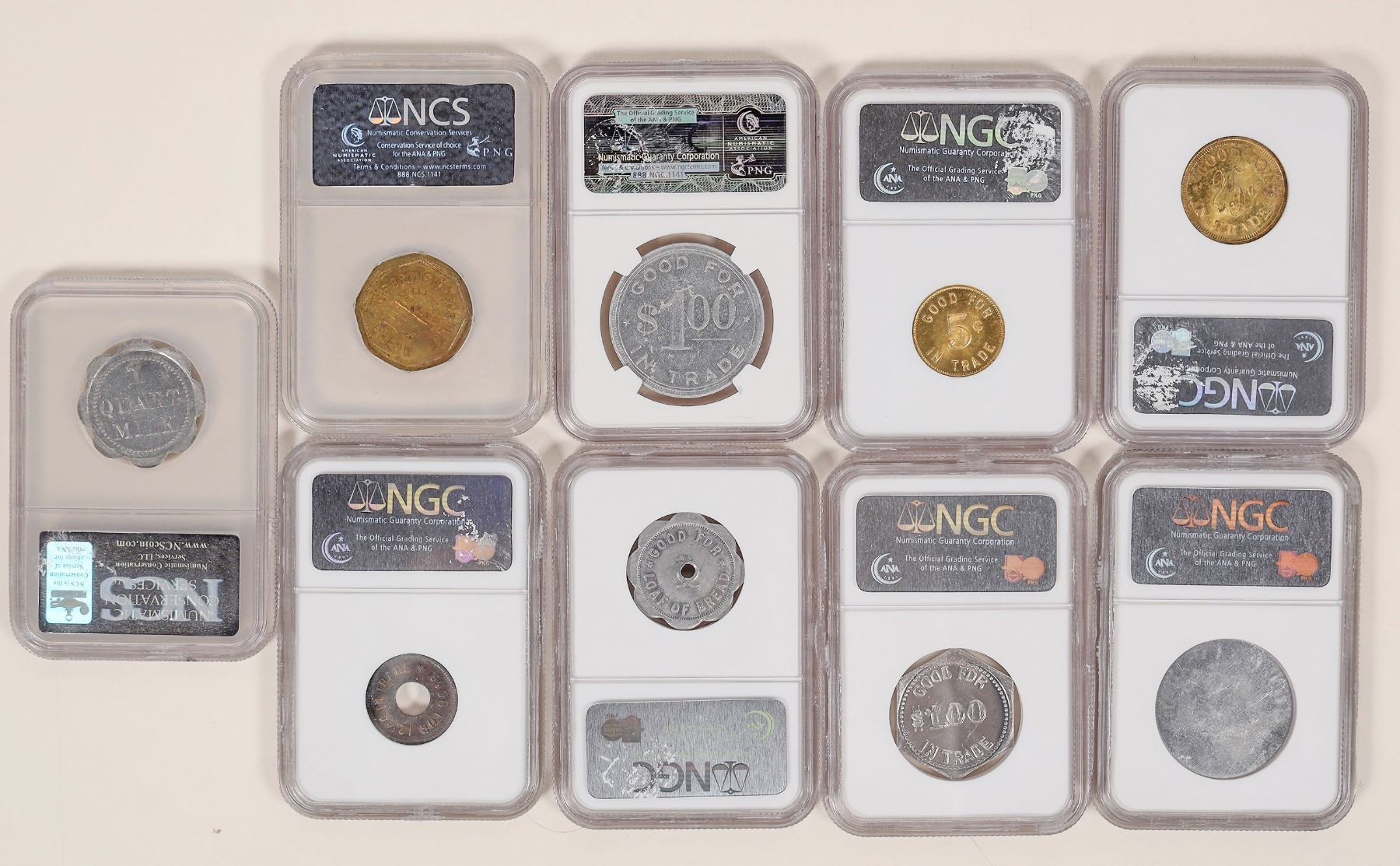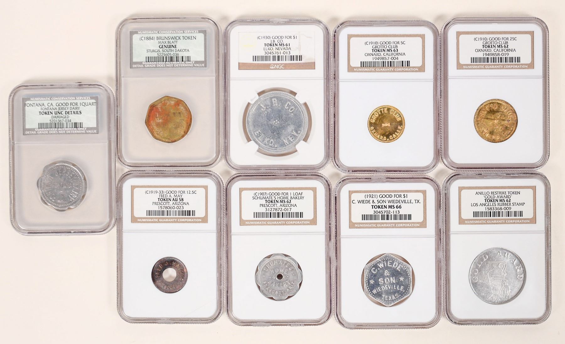 Lot of nine graded tokens: 1) NGC MS 66: C. Wiede & Son, Wiedeville, Texas, GF $1; 2) NGC MS 63: Grotto Club, Oxnard, California, GF 5c; 3) NGC MS 62: Schumate's Home Bakery, Prescott, GF 1 loaf; 4) NGC MS 62: Grotto Club, Oxnard, GF 25c; 5) NGC MS 62: Gold Award Los Angeles Rubber Stamp; 6) NGC MS 61: J. B. Co., Elko, Nevada, GF $1; 7) NGC AU 58: Fred A. May, Prescott, Arizona, GF 12.5c; 8) NCS Token UNC Details damaged: Fontana Jersey Dairy, GF 1 Quart; 9) NCS Genuine: Max Blatt, Sturgis, South Dakota, BBC billiard, territorial token.