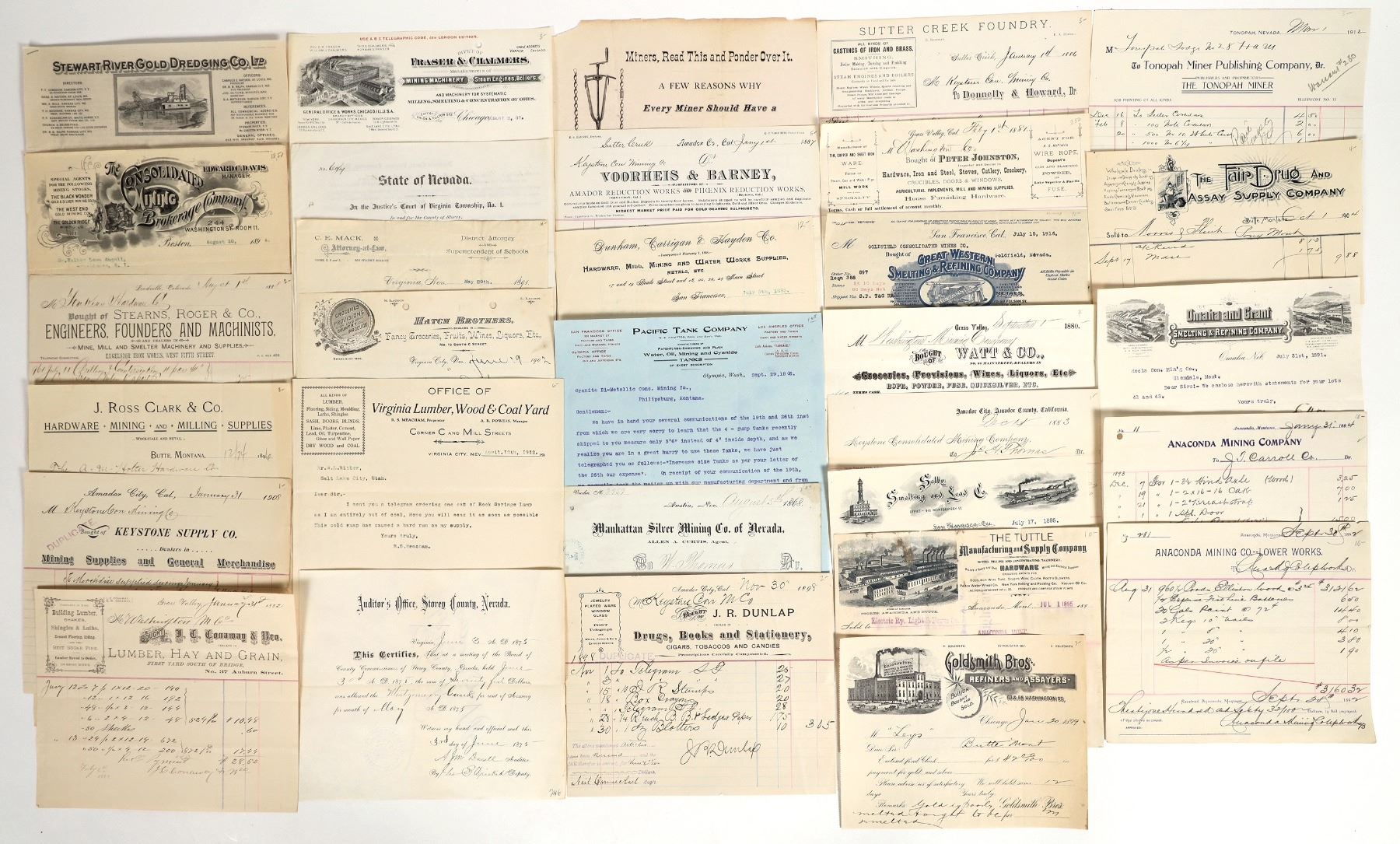 Lot of 30. 1) California: Voorheis & Barney, Sutter Creek BH 1887; Stewart River Gold Dredging Co. letter to Stockton, 1910;Dunham, Carrigan & Hayden LH SF 1895; JR Dunlap BH, Amador City, 1898; Keystone Supply Co. BH, Amador, 1908; JC Conaway & Bro. BH Grass Valley, 1882; Sutter Creek Foundry BH 1886; Peter Johnson BH Grass Valley 1881; Keystone CMC receipt 1883; Watt & Co. BH Grass Valley 1880; Great Western Smelting & Refining BH, SF, 1916; Selby Smelting SF 1895. 2) Nevada: three different Virginia City letterheads, 1890s-1910s, plus two county documents, 1870s; Manhattan SMC BH, Austin, 1868; and Tonopah Miner Publishing Co. BH 1912. 3) Montana and Colorado, incl. Stearns, Roger & Co. Leadville 1888;J Ross Clark & Co. Butte 1896; three Anaconda pieces, Fair Drug & Assay Supply Butte 1904; McMurtrie Miner's Drilling Machine advertising flyer, and more. Please inspect.