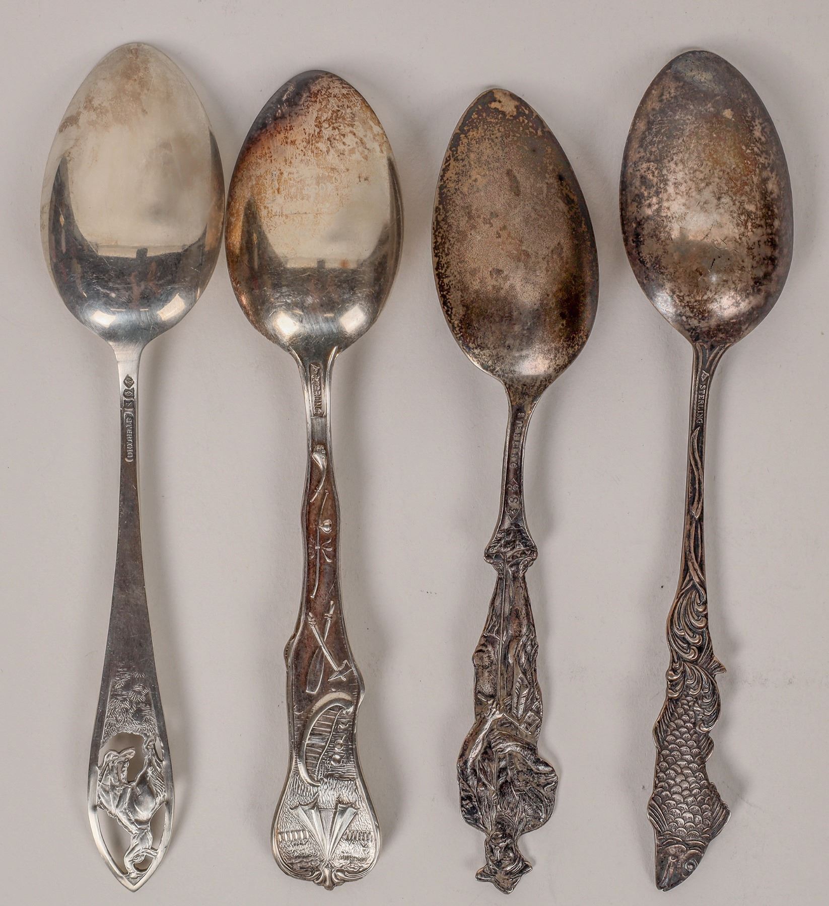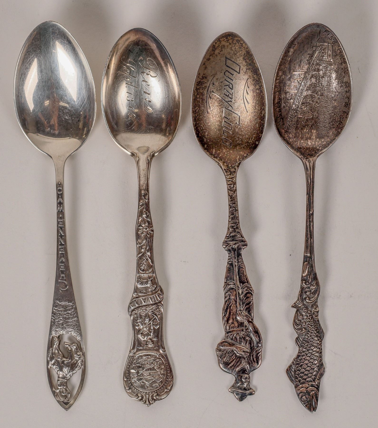 Sterling silver souvenir spoons from Wyoming (2), Colorado (1) and Reno, Nevada (1). All measure 5.5". Two are tarnished but can easily shine up. Wyoming