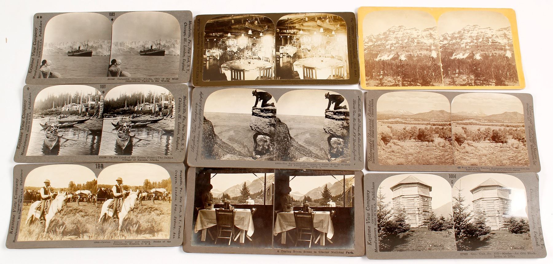 Lot of 8. 1) Montana: c.1880s Yellowstone scenery view by Calfee & Catlin, Bozeman, Montana Territory; dining room scene in Glacier National Park by NA Forsyth, Butte, Montana; and a Keystone card showing a cowboy, bronco corral and camp on the banks of the Yellowstone. 2) Arizona: Keystone 13663 showing man on edge of Grand Canyon vista; HC White No. 12248 El Tovar Hotel dining room in the Grand Canyon; and an Underwood & Underwood scenery card of the San Francisco Mountains (near Flagstaff). 3) Alaska: three Keystone cards, including Columbia Glacier, an old block house at Sitka, and the Indian village of Kasaan. (Prag Collection) Date: Location: Montana HWAC # 54771