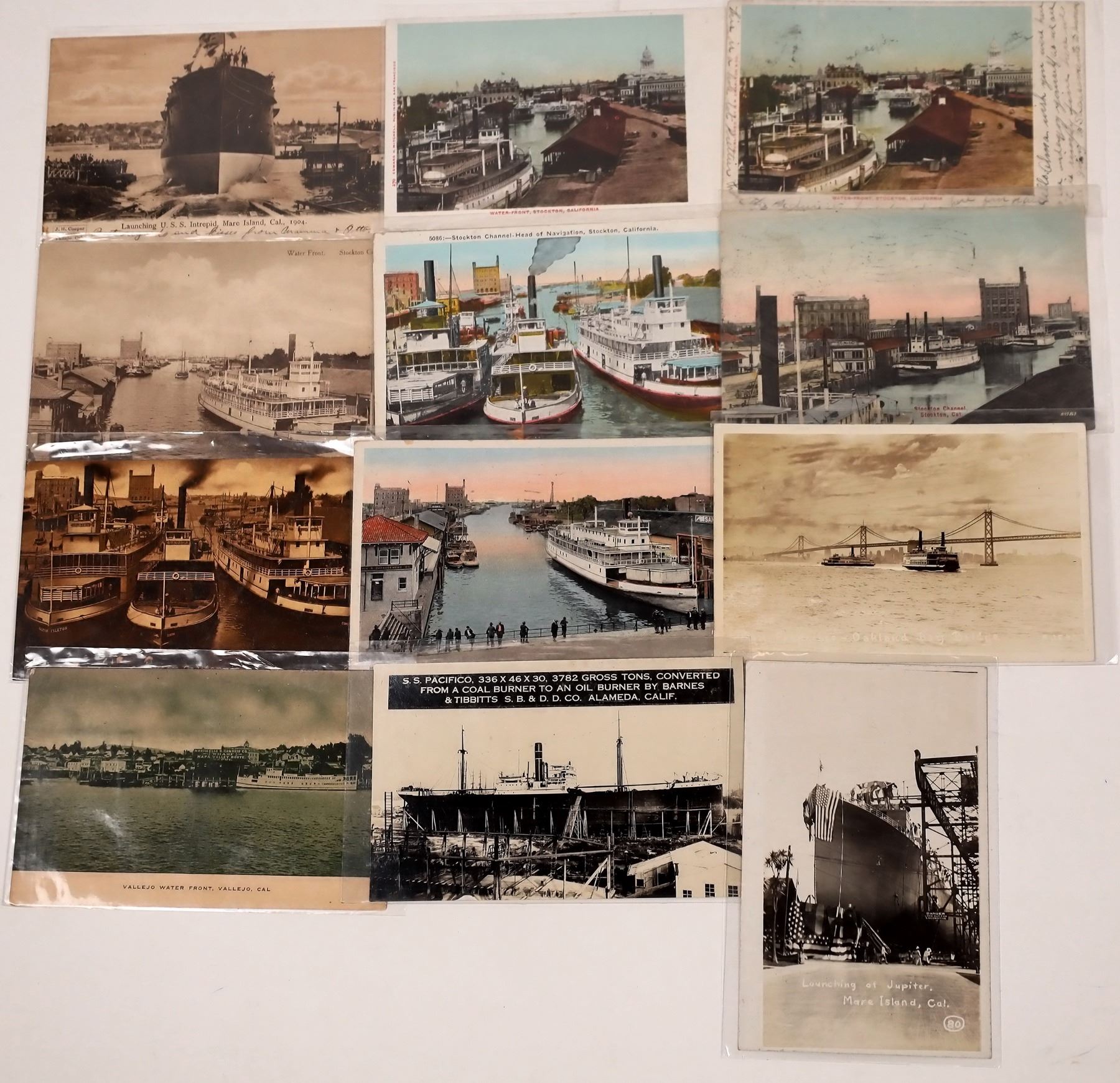Lot of 12 incl. 3 real photo and 3 undivided back. Includes: launching of Jupiter at Mare Island; San Francisco-Oakland Bay Bridge; launching USS Intrepid at Mare Island; Head of Navigation at Stockton; Stockton Channel; and the Vallejo waterfront.