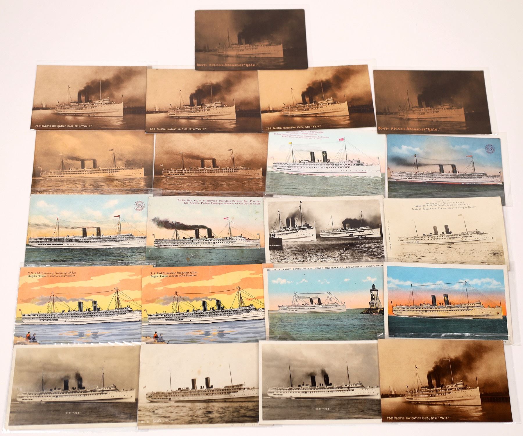 Lot of 21. Includes 5 real photo postcards, 8 amber, and 8 divided back printed cards. Both steamships are owned and operated by Pacific Navigation Company (later Los Angeles Steamship Co.). Running between Los Angeles and San Francisco. Duplication.