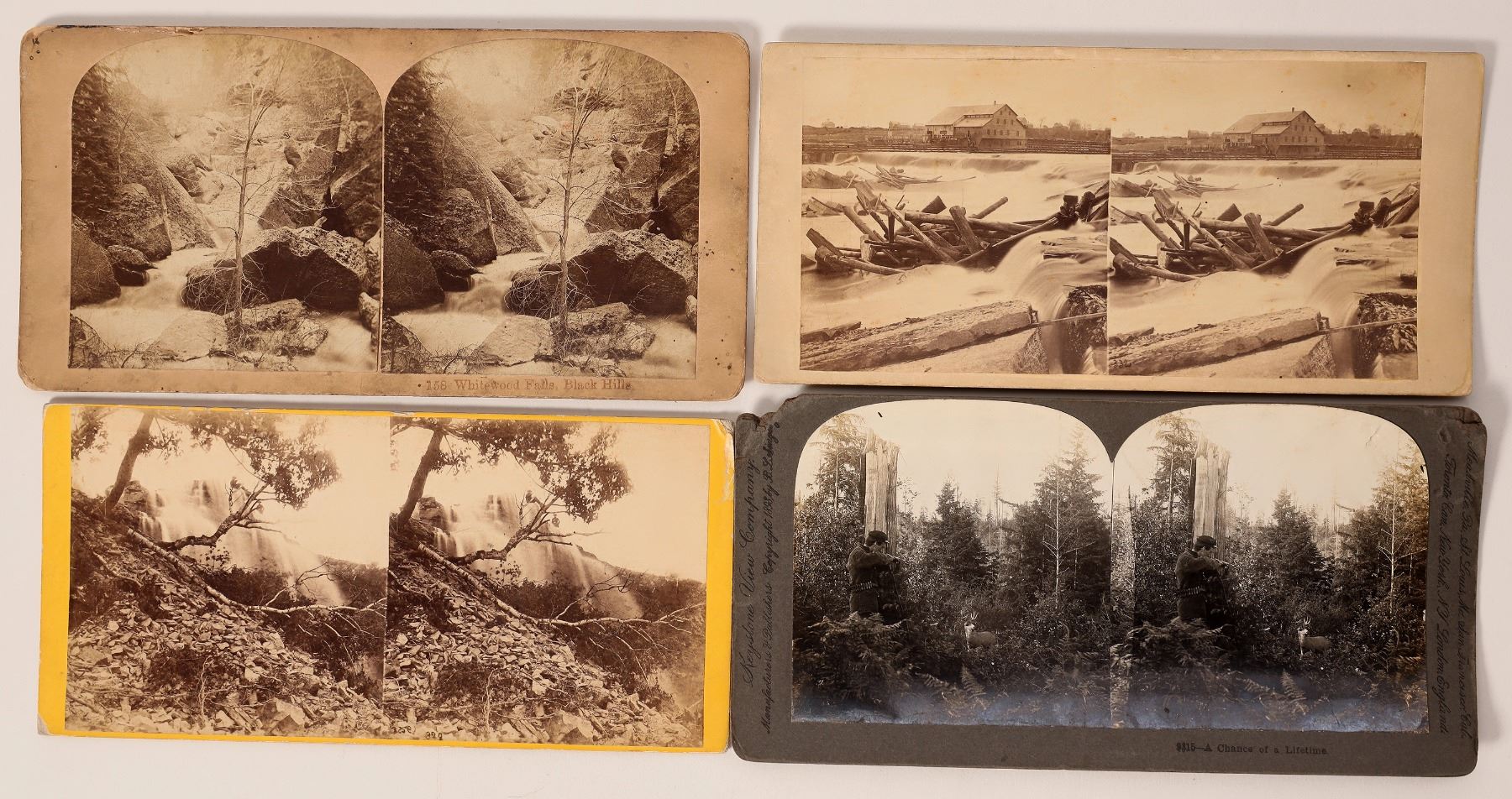 4 Western US stereoviews. 2x Cascade of St. Anthony, deer hunting, Whitewood Falls. [