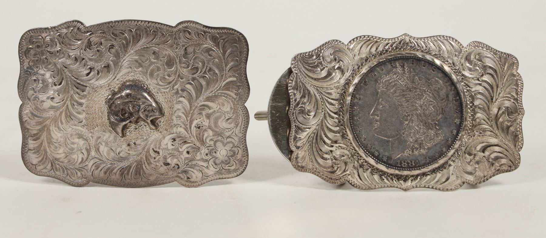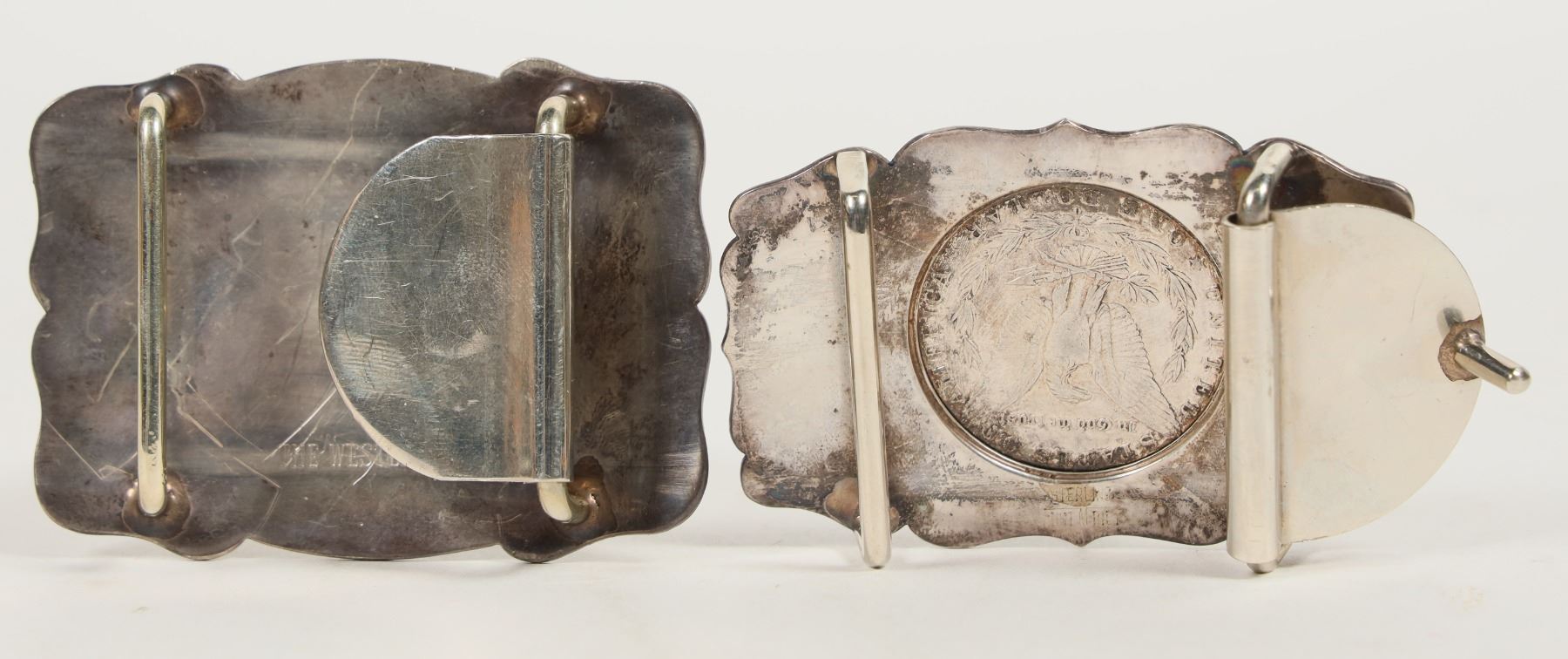 Two Western Sterling Silver Cowboy Belt Buckles. Both intricately engraved with western scroll. 1) Common date 1881 New Orleans silver dollar marked on reverse: Sterling / CustMBlt / Reno, Nev. 3 x 2 inches. 71.6 grams. 2) Fish Buckle marked on reverse: 14k / Sterling / Reno, Nev / THE WESTERNER. 3 x 2 inches. 66.6 grams. Both buckles belonged to Lothar Jahn, descendent of the Reich / Schnitzer Family of Virginia City Comstock fame.