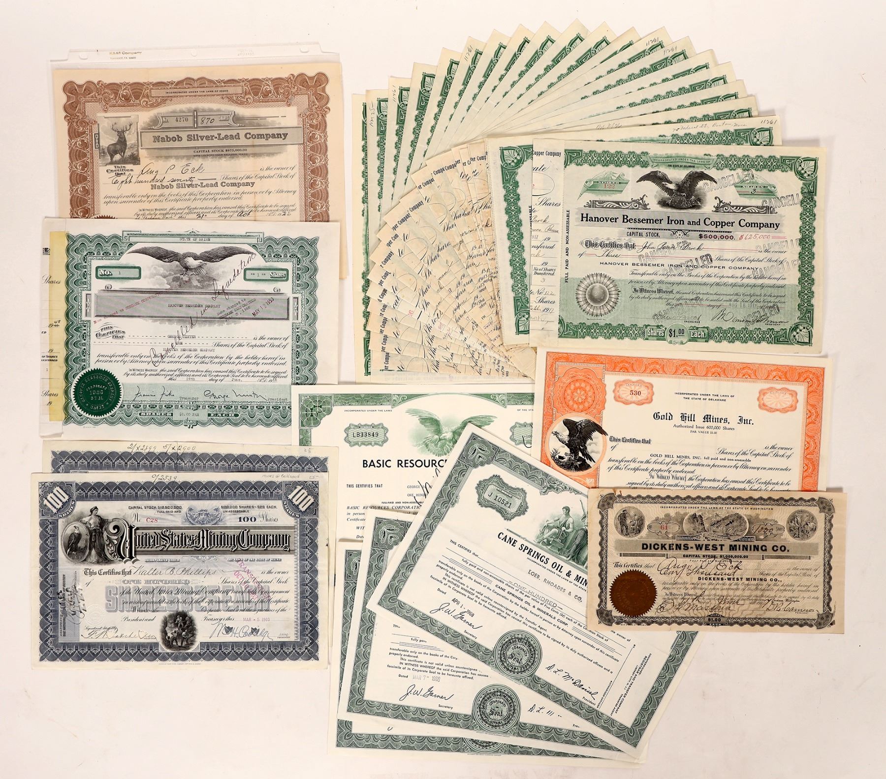About 40 Western mining stock, no Nevada or California. Basic Resources, Gold Hill, Cane Springs Oil & Minerals, Hanover Bessemer Iron and Copper with duplicates, Nabob Silver Lead, Dickens West, United States Mining.