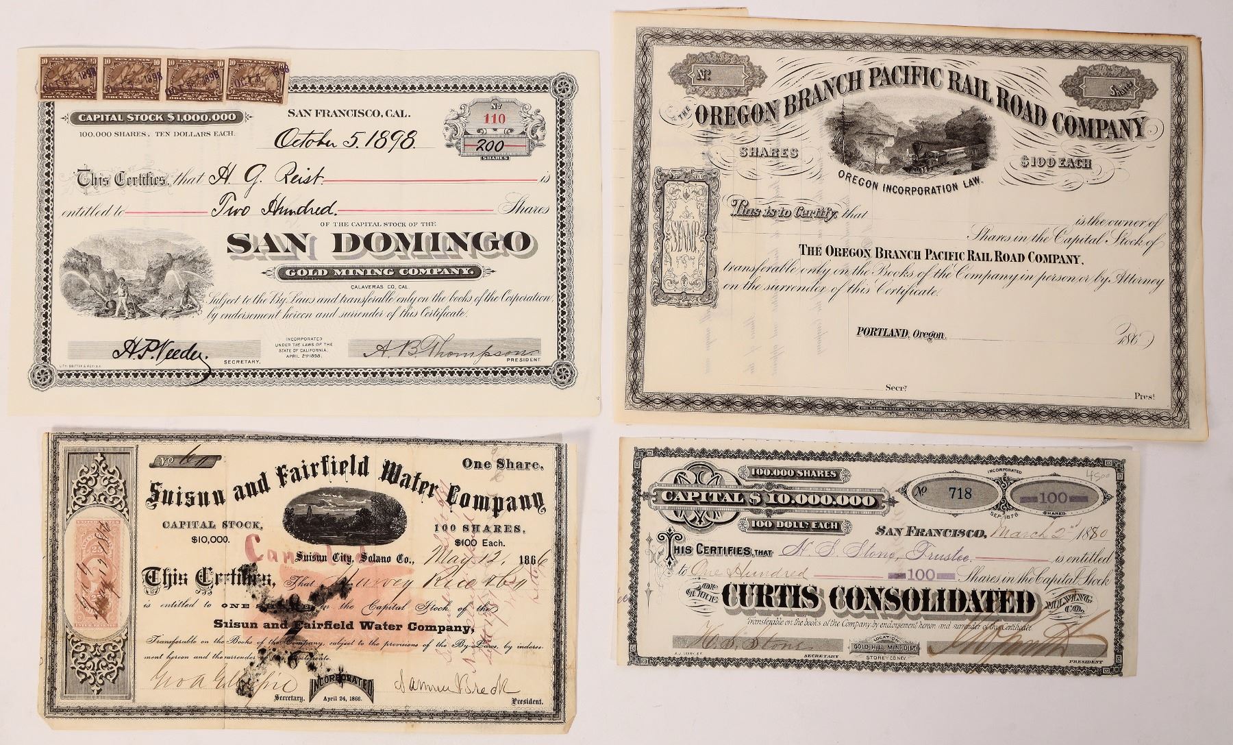 Issued 1866 Suisun and Fairfield Water, 1898 San Domingo Gold Mining. Unissued Oregon Branch Pacific Rail Road.
