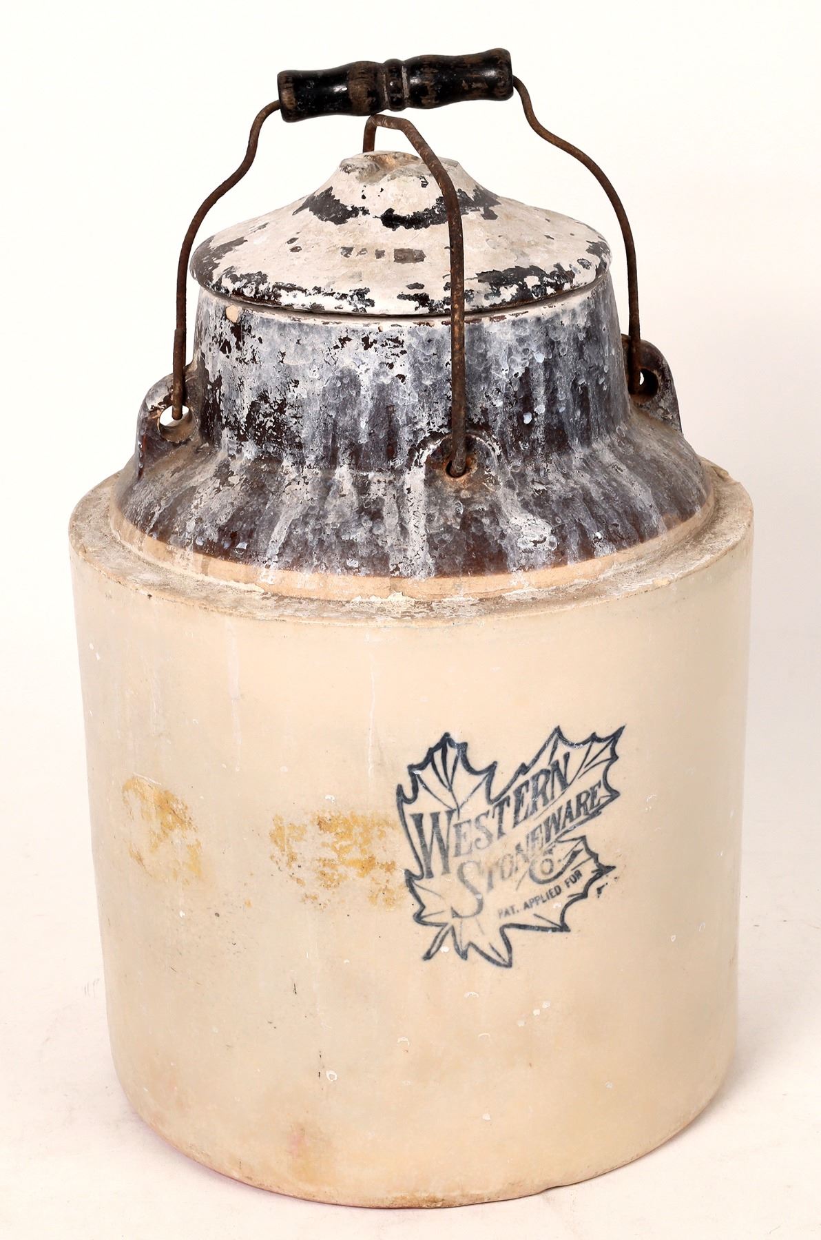 2 tone swingtop and handle Western Stoneware container. 3 shoulder chips, white upper residue. 15x9".