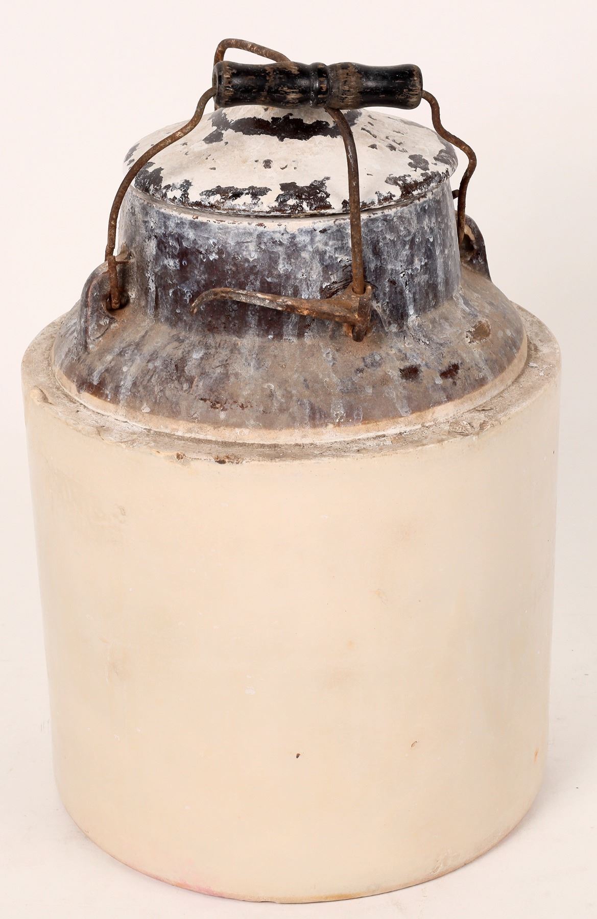 2 tone swingtop and handle Western Stoneware container. 3 shoulder chips, white upper residue. 15x9".