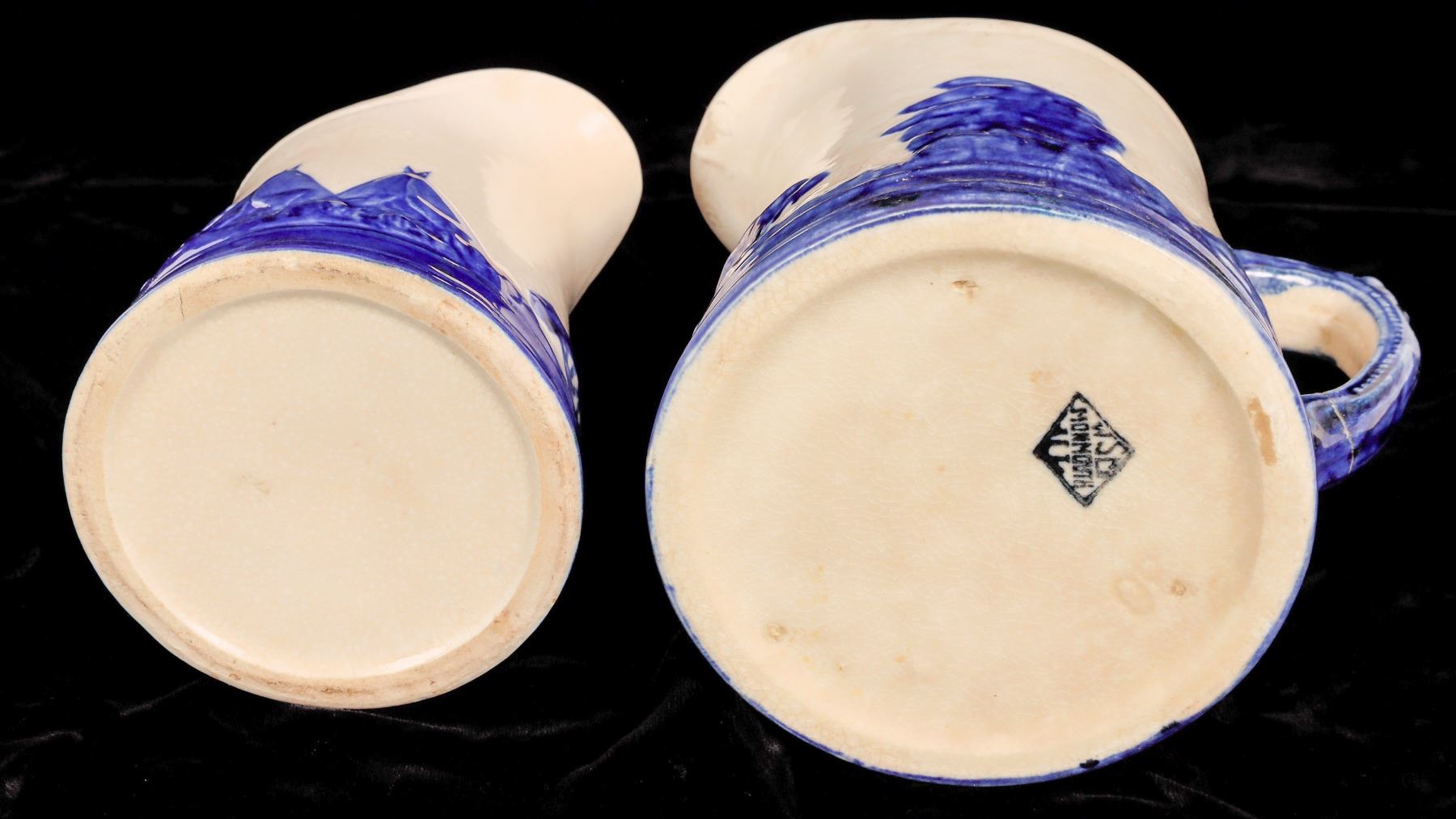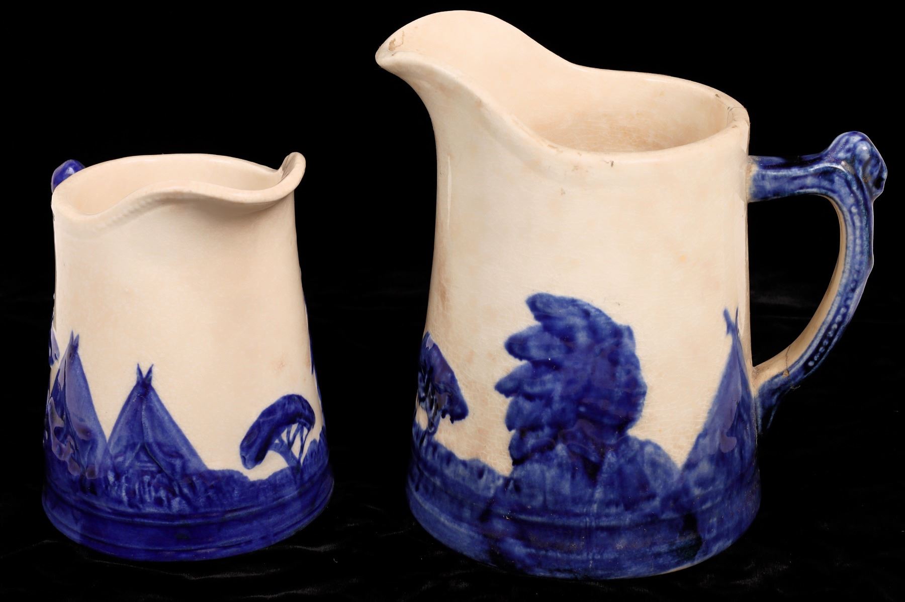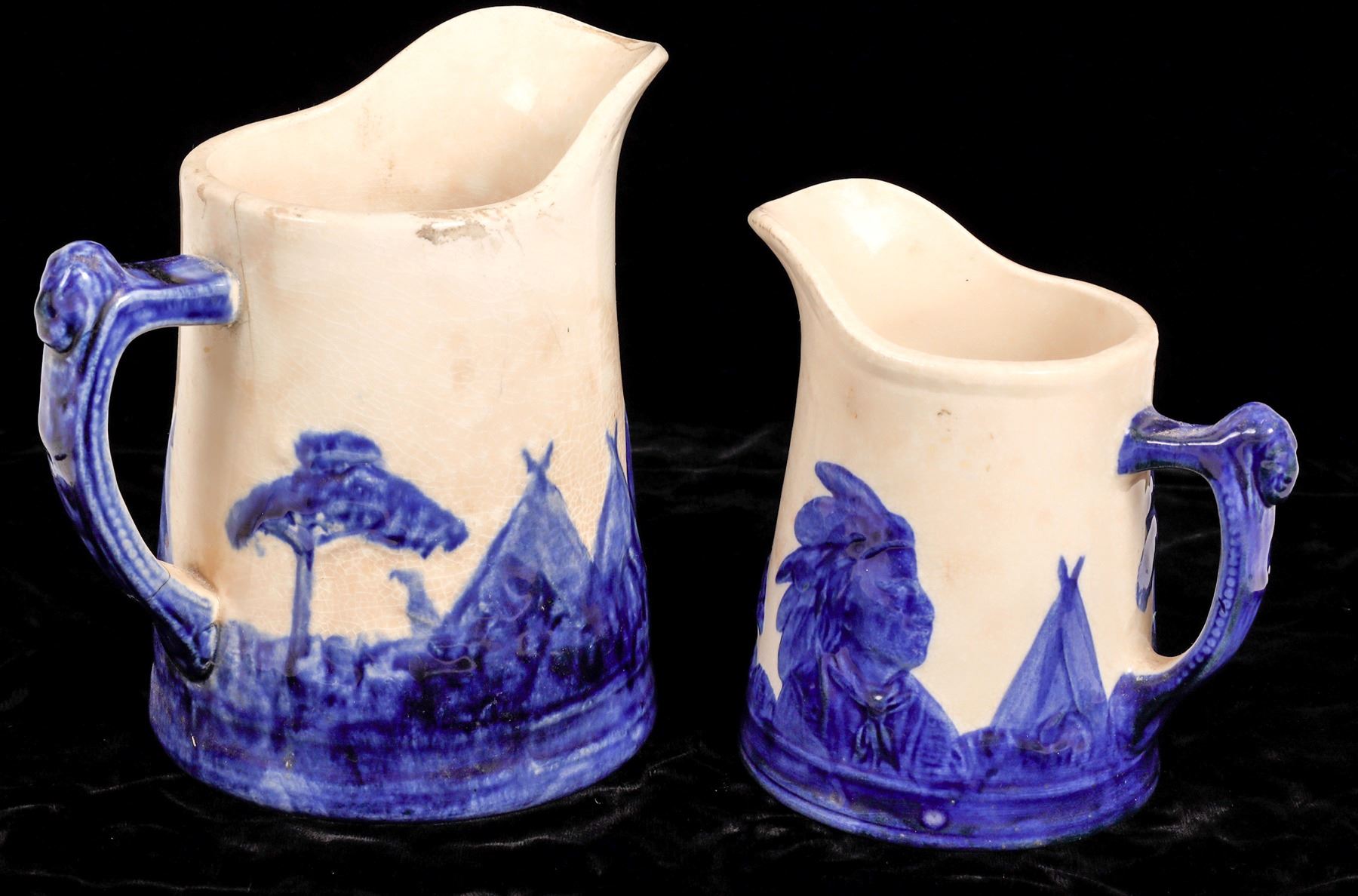 2 Western Stoneware pitchers. c. 1906-85 with flaming blue Native American images. Page 513 in Lehner. 5.25x4.75" and 6.5x6.5" with 2" crack inside behind handle, handle repair etc. Please inspect.
