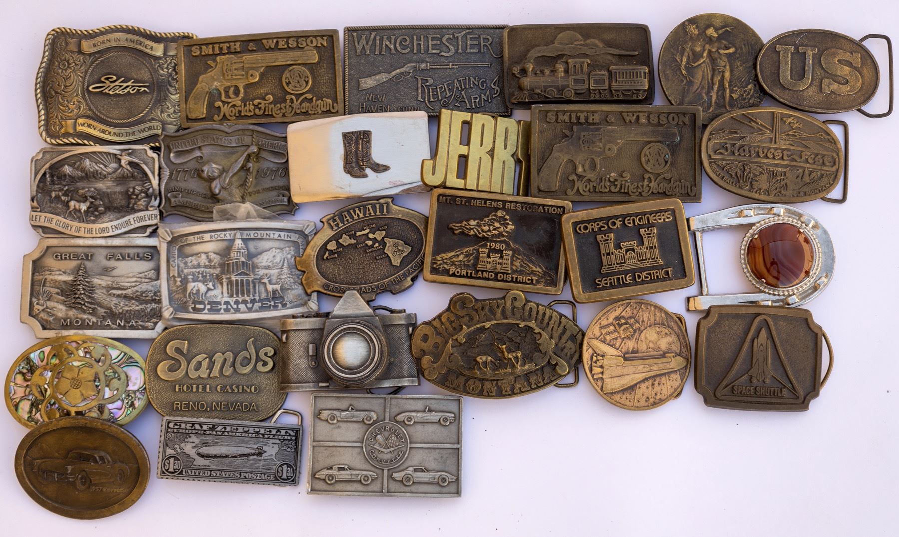 This is one lot you need to see the photograph to visualize what is there. There is a Stetson, Great Falls, Harvest fest, Mt. St. Helens Restoration, Corp of Engineers Seattle, 1957 Corvette, Smith & Wesson, Winchester Repeating Arms, U. S. in military style, Sands Casino in Reno, Graf Zeppelin, cowboy boots, etc. State: City: Date: Provenance: