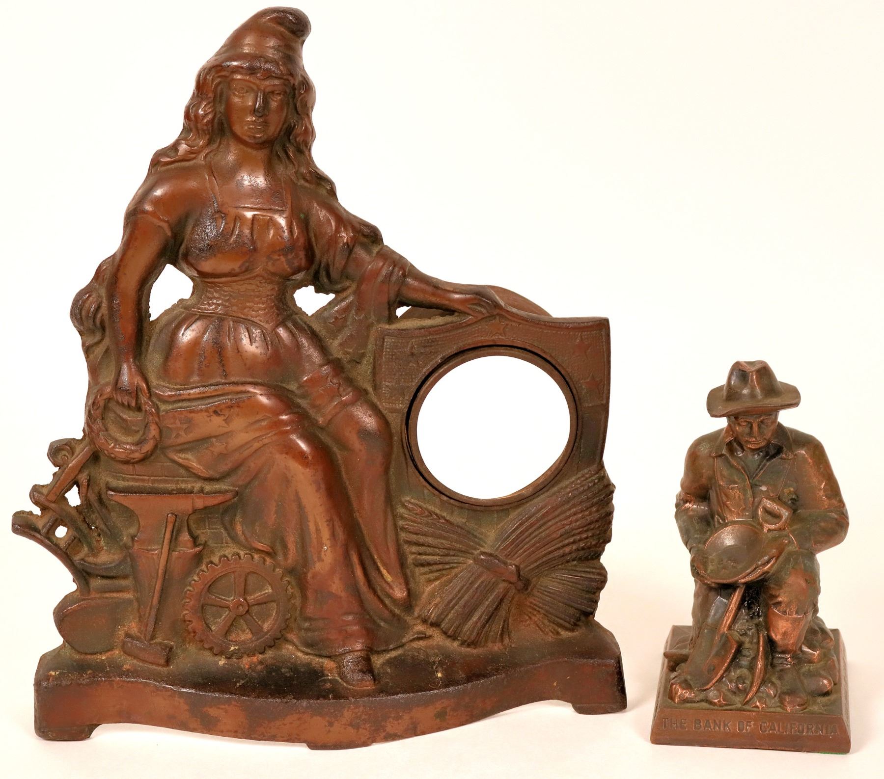 Desktop Western-themed Collectibles. Very fine original, c1880, desktop cast iron (copper plated), 11 x 12”, held a large sized men’s pocket watch (not present); Bank of California miner with gold pan desktop piece, c1930’s (?) 4 x 4 x 7”.
