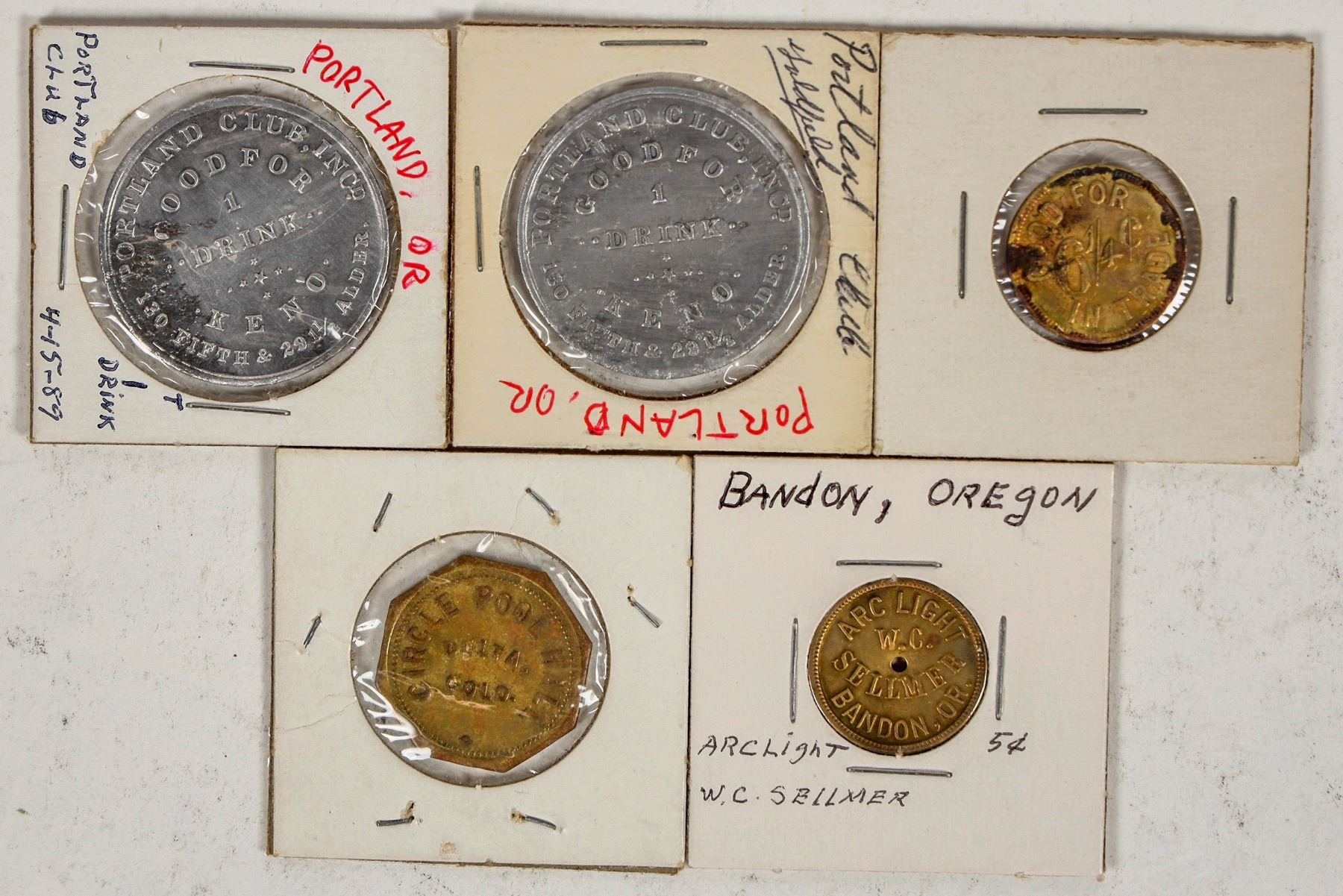 Group of 5 western tokens. Standout coin is an octagonal token for 25c in trade at Circle Pool Hal in Delta, Colorado. This coin has appealing signs of aging with darkened letters, lightened haloing around the letters, and overall interesting presentation. Duplicate tokens for a free drink at Portland Club, Oregon with darkening on one coin and a striking defect on the other resulting in a welt across the front of the coin. See photo.