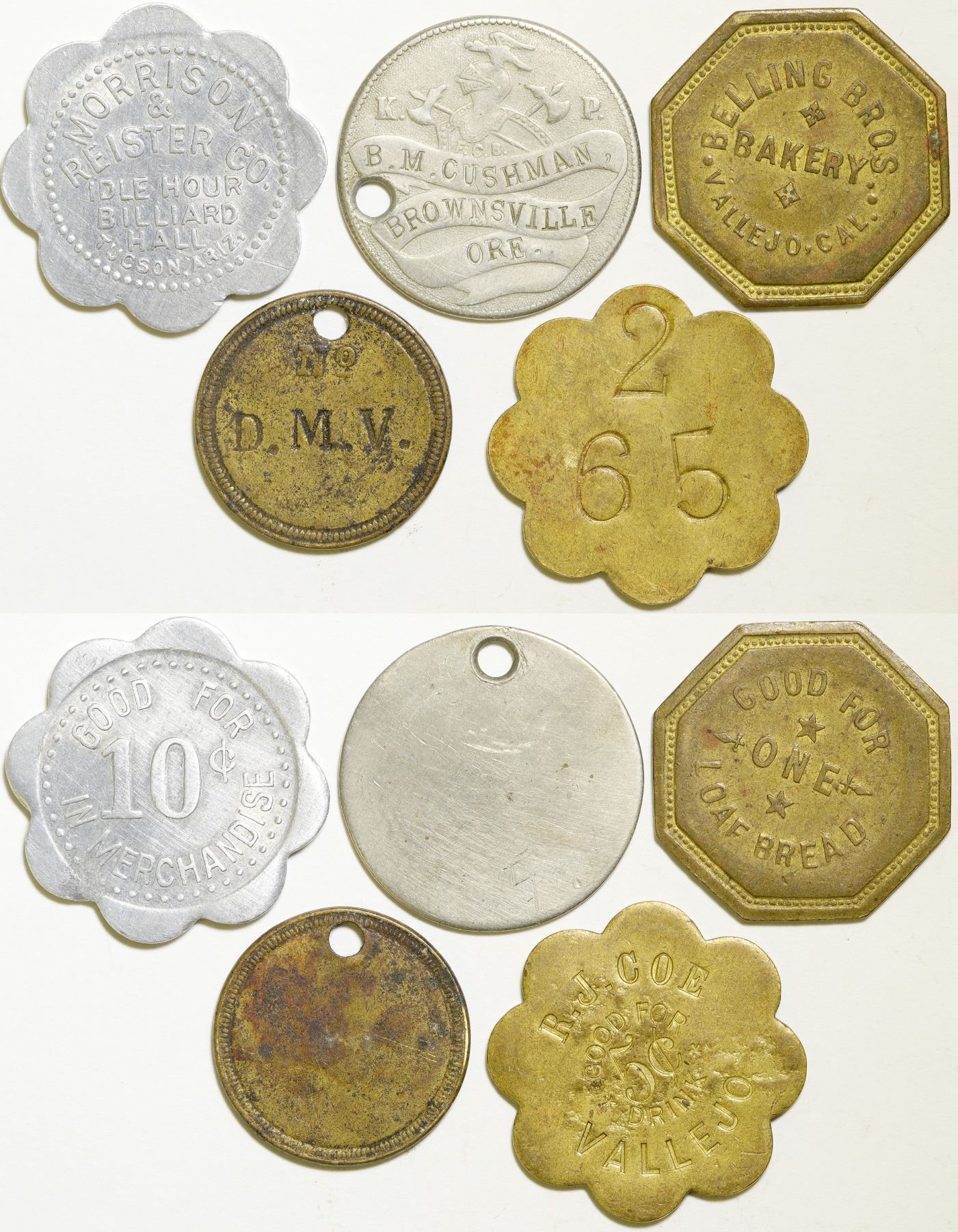 Lot of five: R. J. Coe, GF 5c drink, Vallejo; B. M. Cushman, Brownsville, Ore.; Idle Hour Billiard Hall, Tucson, Ariz.; two mavericks.