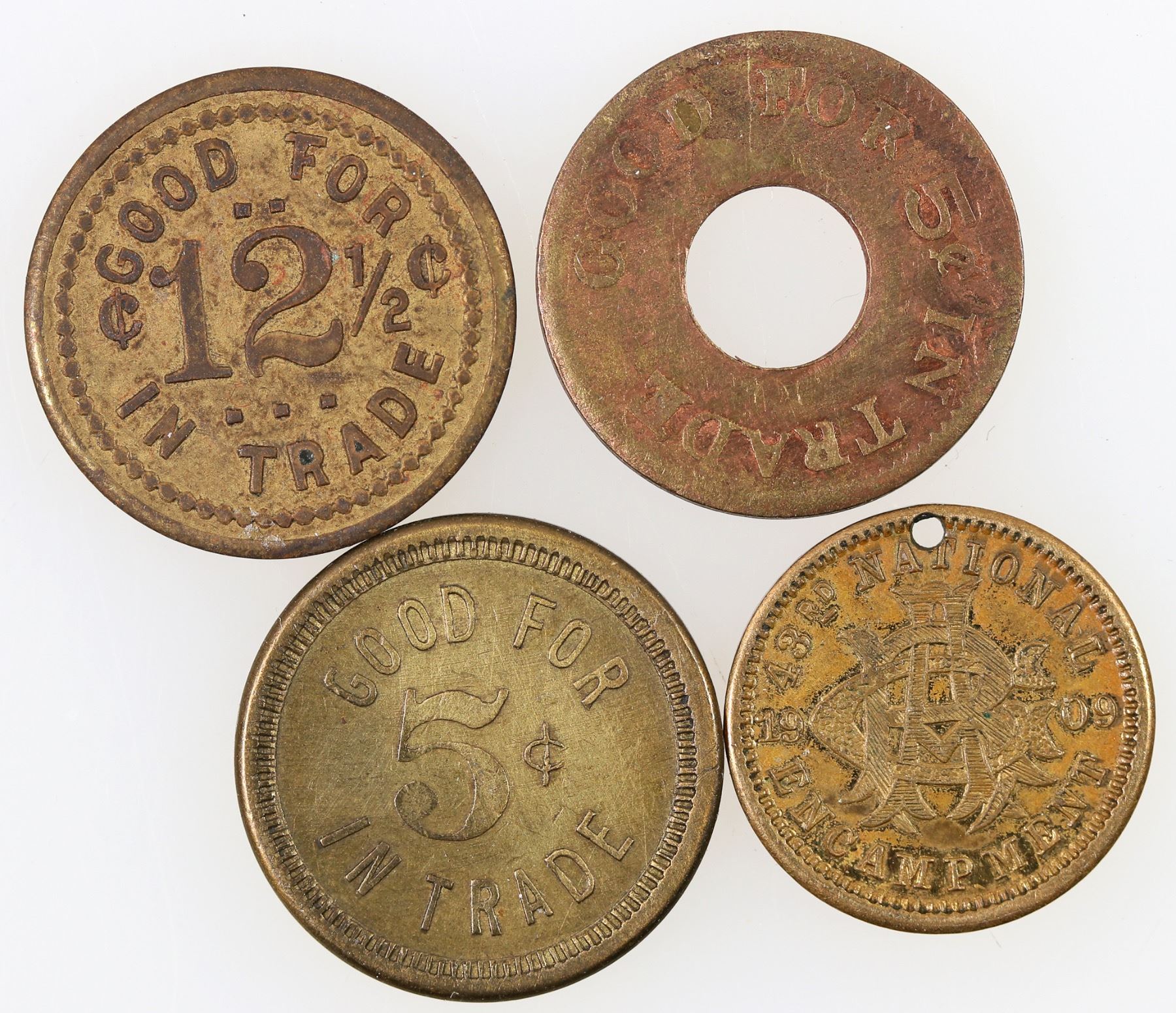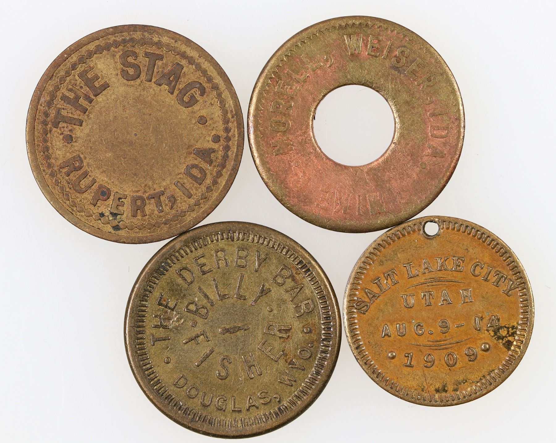 Four tokens: 1) The Derby Bar, Douglas, Wyoming; 2) 1909 43rd National Encampment Salt Lake City; 3) Mike Morell, Weiser, Idaho; 4) The Stag, Rupert, Idaho.[
