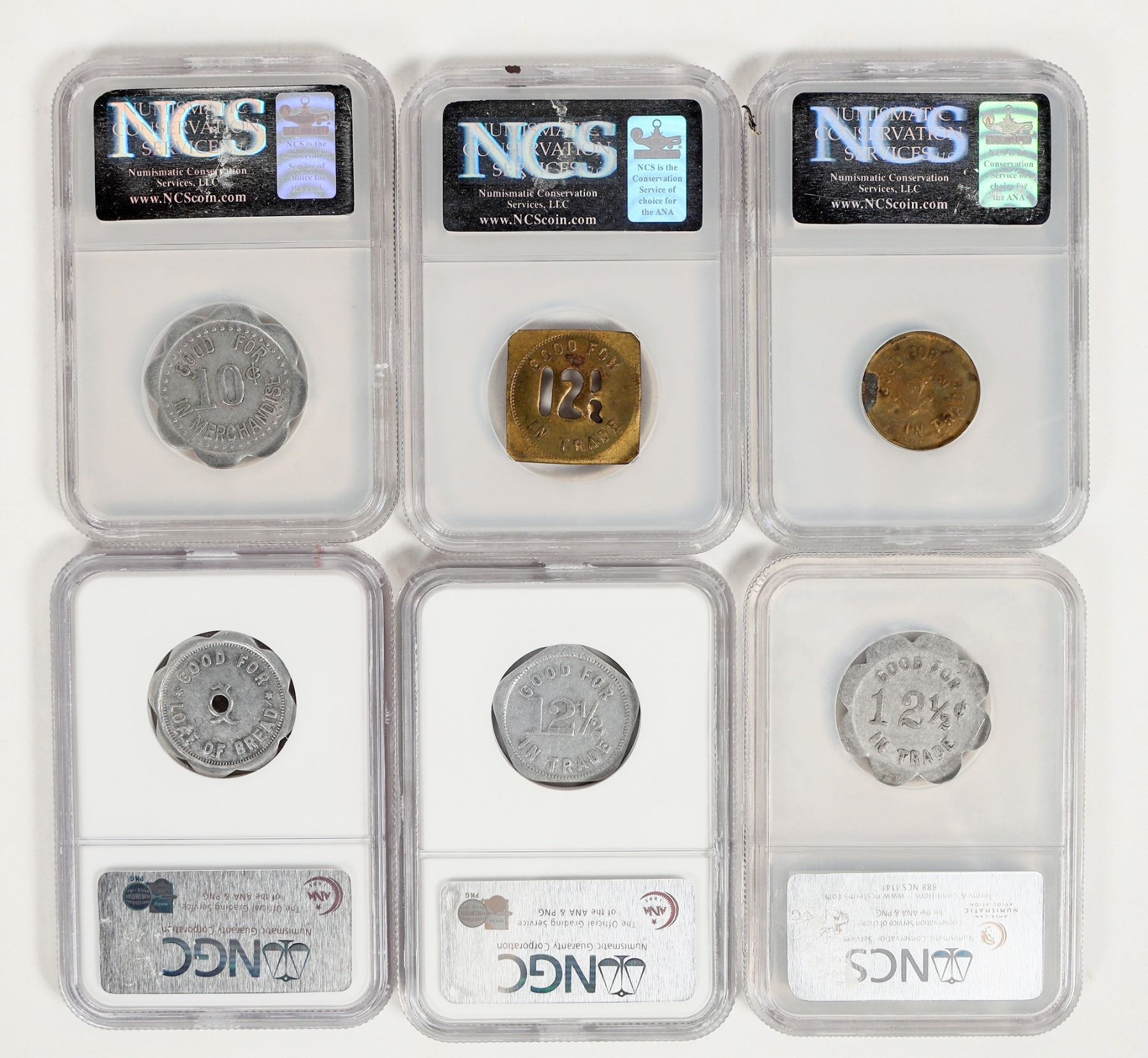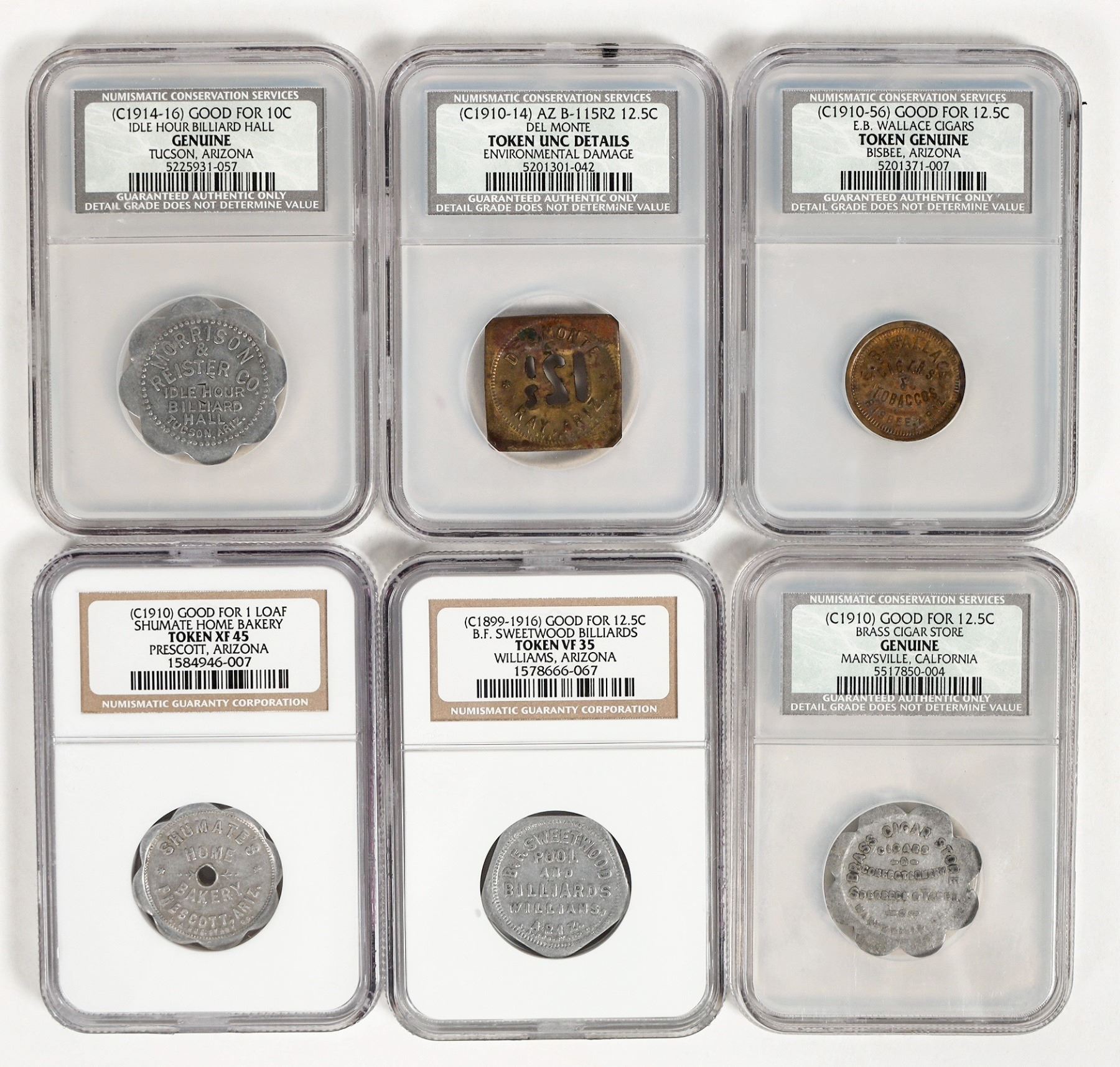 Western Token group 6 pcs Ray Williams, Prescott, Bisbee, Tucson, AZ. Marysville, CA.