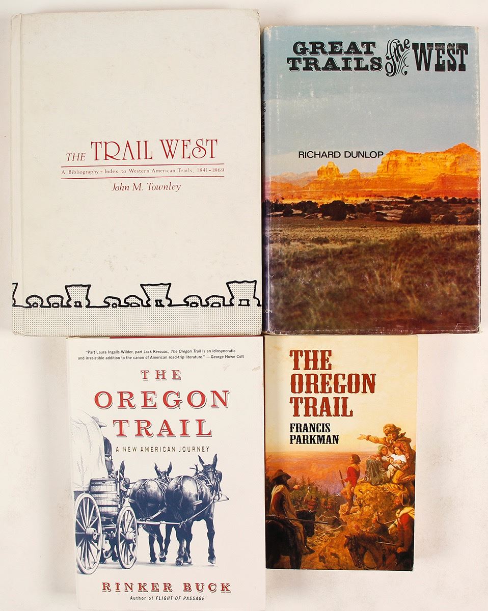 Lot of 4 books 1) The Oregon Trail by Francis Parkman (paperback) pp.381; 2)The Oregon Trail, A New American Journey by Rinker Buck, c. 2015, pp.430; 3)Great Trails of the West by Richard Dunlop, c. 1971, pp.304; 4)The Trail West A Bibliography-Index to Western Ameircan Trails, 1841-1868 by John M. Townley, pp.309. Date: Location: HWAC# 63451
