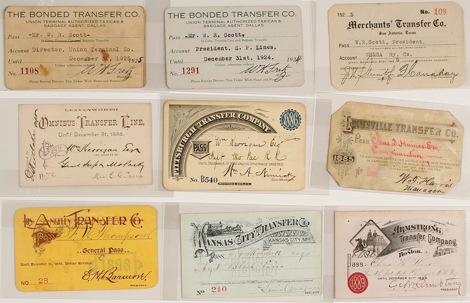 Lot of nine passes for transfer companies, who would transport passengers from the train depots to hotels/private residences and vice-versa. Best is a pictorial Kansas City Transfer Co. pass for 1885 (stage vignette). Also a great pictorial pass for Armstrong Transfer Co. (of Boston) for 1889 with wagon and train vignettes. Other pieces include: 1898 pass for Los Angeles Transfer Co; 1885 for Louisville Transfer Co.; 1886 for Pittsburgh Transfer Co.; 1886 for Leavenworth Omnibus Transfer Line; 1924 and 1925 for the Bonded Transfer Co (Dallas); and a 1925 for the Merchants' Transfer Co. (San Antonio). Please inspect. (Potter Collection) HWAC# 59945 Date: 1885-1925 Location: