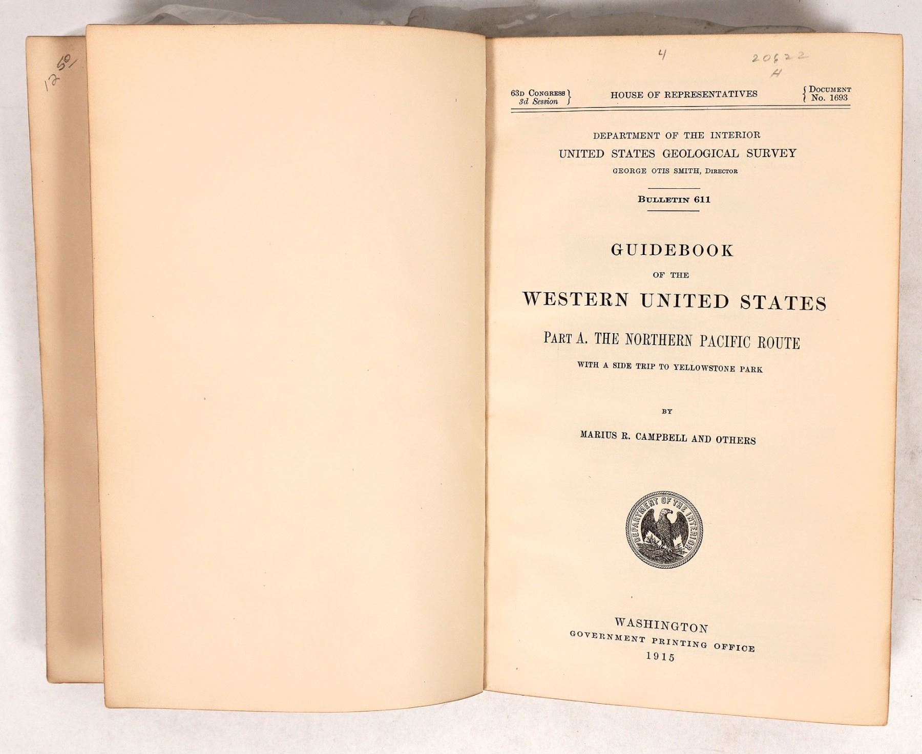 A copy of Volume A of the 'Guidebook of the Western United States' series, written by Marius R. Campbell and others, published in 1915 by the U.S. Department of the Interior. The book consists of text descriptions and color-coded maps of the western United States. Pages are in good condition; cover and binding show some wear, but book is intact.