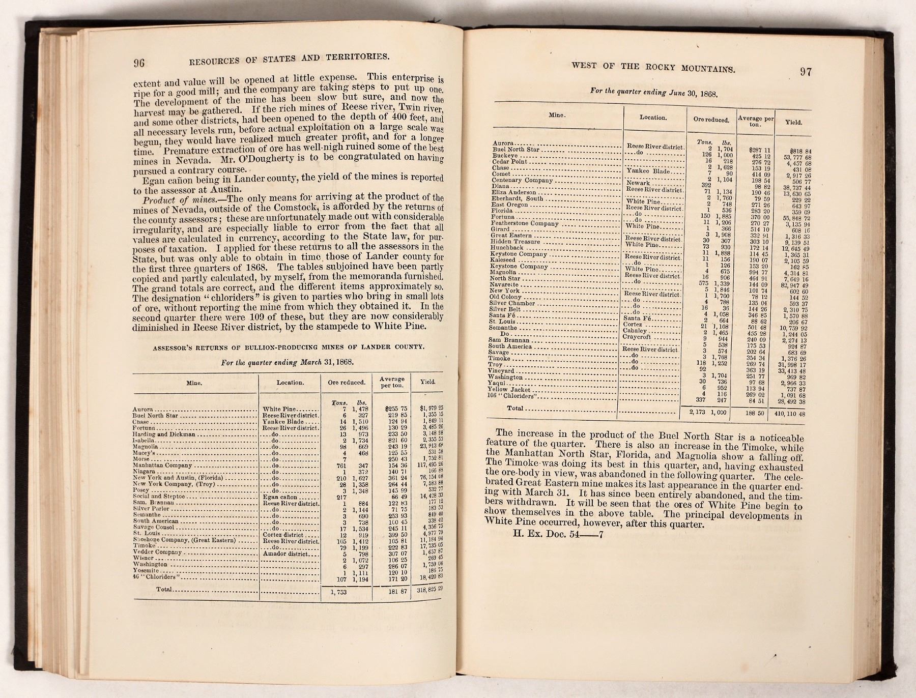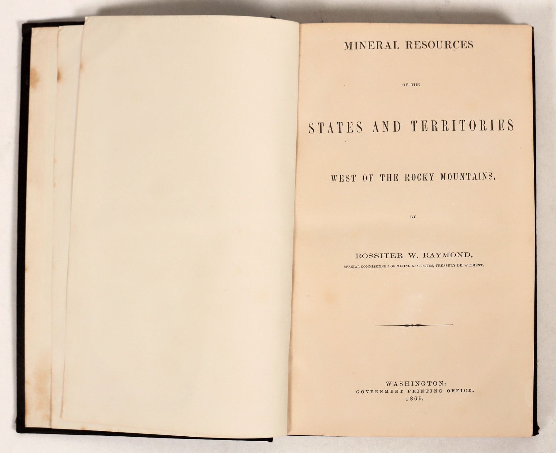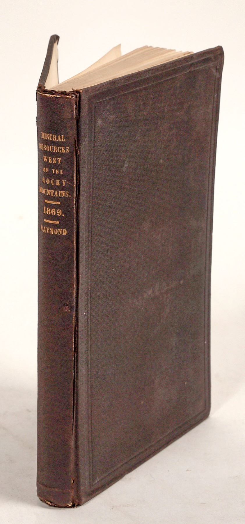 A copy of 'Mineral Resources of the States and Territories West of the Rocky Mountains' by Rossiter W. Raymond, published by the U.S. Treasury Department in 1869. The book documents the U.S. mining industry and potential future mining ventures; it also discusses the role of the U.S. government in the country's mining industry. Book has some wear on cover and spine but is intact and generally in good condition.