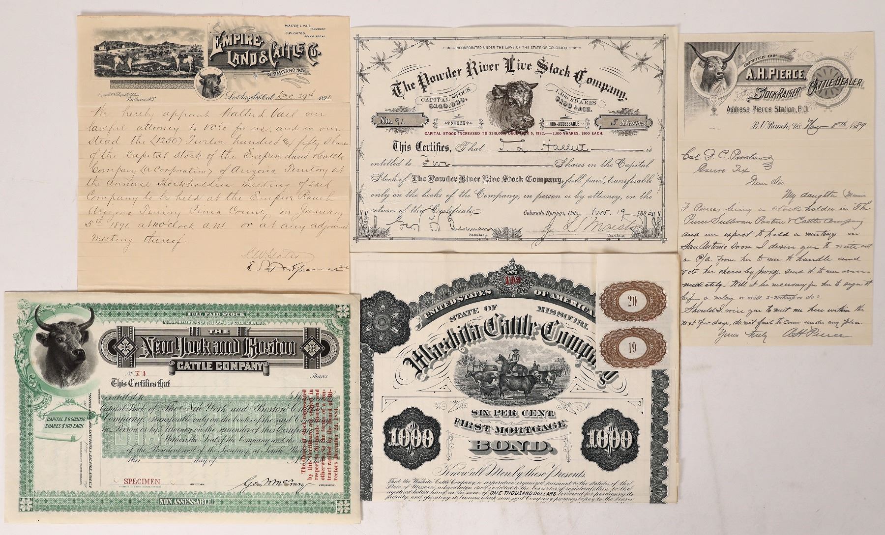 Assorted Western US cattle company ephemera. Stocks-1883 Powder River Live Stock, unissued New York and Boston Cattle 1880's. Bond-1883 Washita Cattle Co. Washita was the land of Black Kettle etc. 1890 Empire Land & Cattle, Los Angeles, CA pictorial letterhead. 1889 A H Pierce, B U Ranch, Tex. pictorial letterhead.