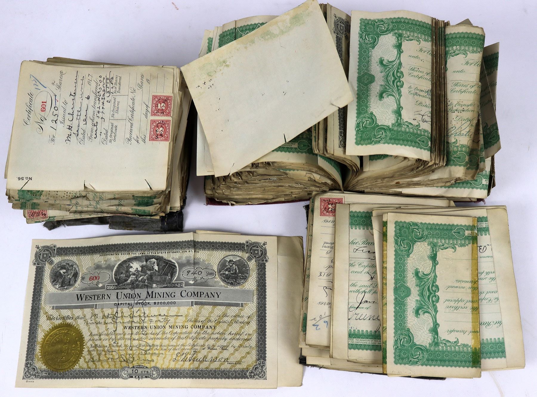 Lot of approx. 450 stock certs all issued by Western Union Mining Company of Wallace, ID. Dated from 1917 - 1922. Certs # 2506 - 2756 folded and attached in small hardbound booklet. Many with revenue stamps. All cancelled. City:Wallace State:Idaho Date: