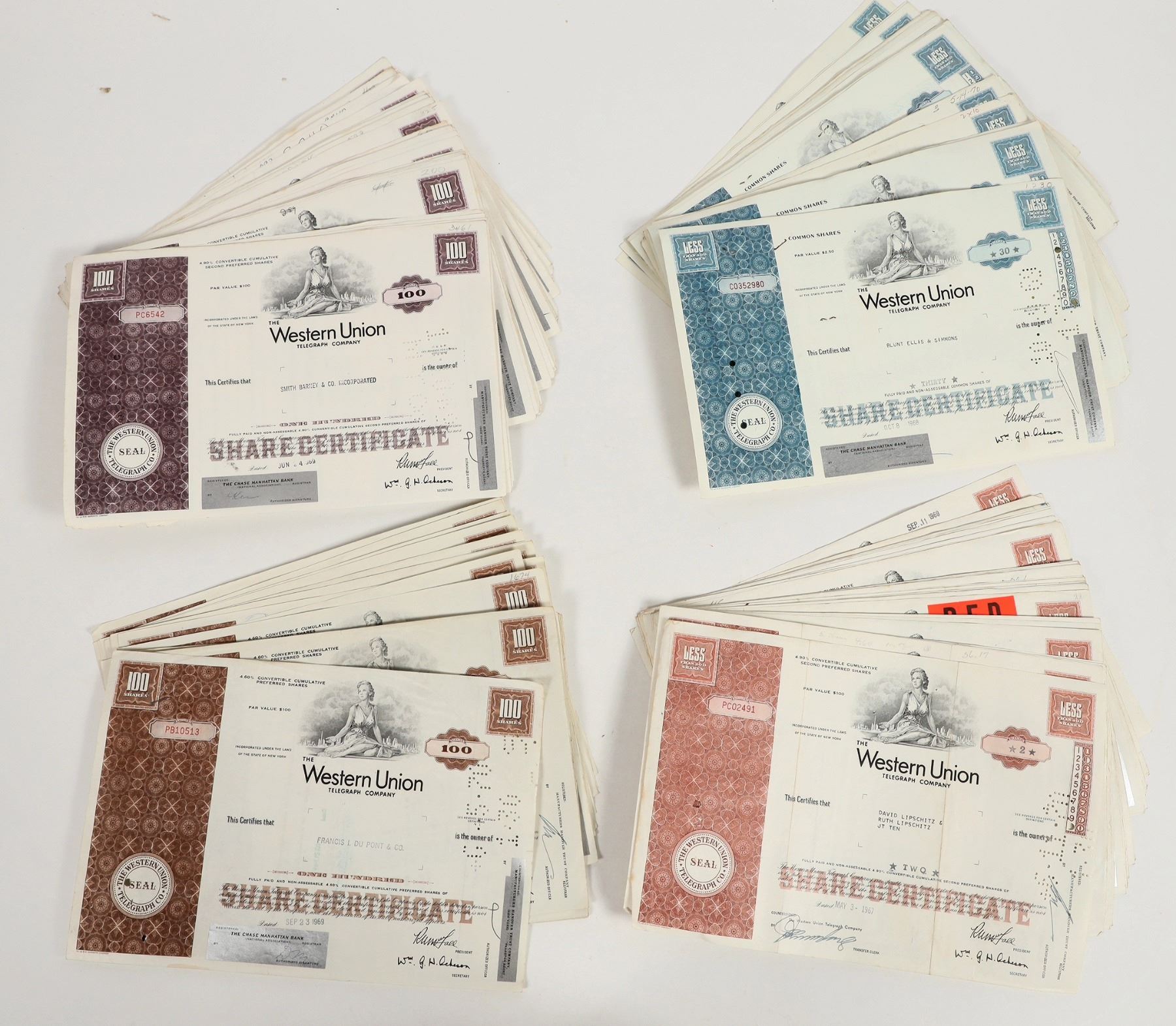 Over 200 Western Union Telegraph Co. Stocks issued in the late 1960s, most with signatures, endorsements, revenue stamps, etc. on reverse. At least 5 varieties in light and dark blue, purple, brown, pink for both common shares convertible cumulative preferred shares. May contain important signatures.