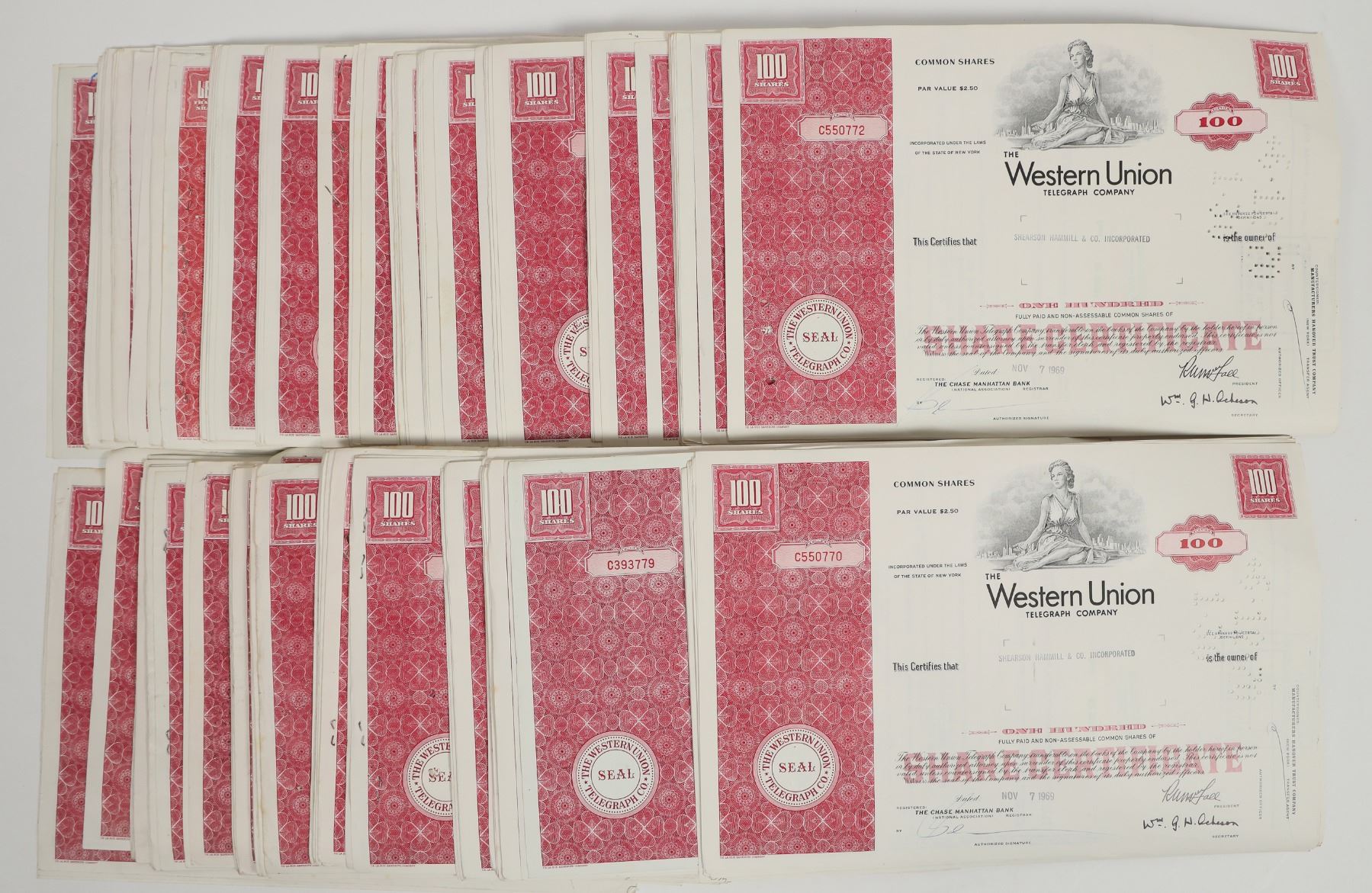 About 250 Western Union Telegraph Co. Stocks issued in the late 1960s, most with signatures, endorsements, stamps, etc. on reverse. Many important stockholders represented and undoubtedly this group contains some valuable signatures. Andres, Posner & Rothchild, Harwood & Co. E. F Hutton & Co., are shareholder in this group, among many others.