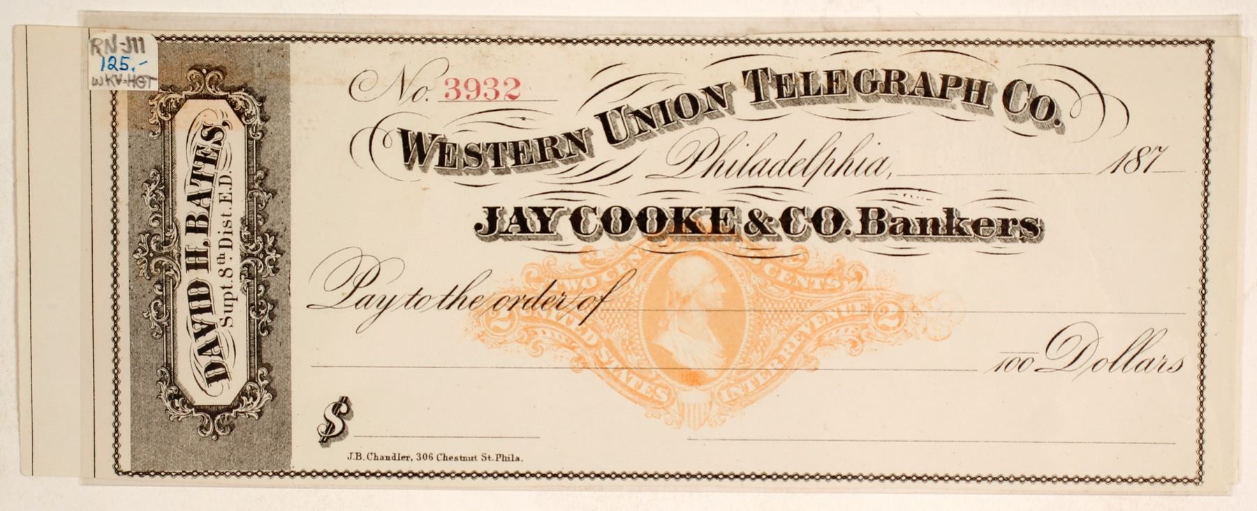 187- date. Printed 'David H Bates, Supt. 8th Dist. E. D.' Has an RN-J11. Numbered 3832. Check on Jay Cooke & Co. Bankers. Vibrant and colorful! State: Pennsylvania City: Philadelphia Date: