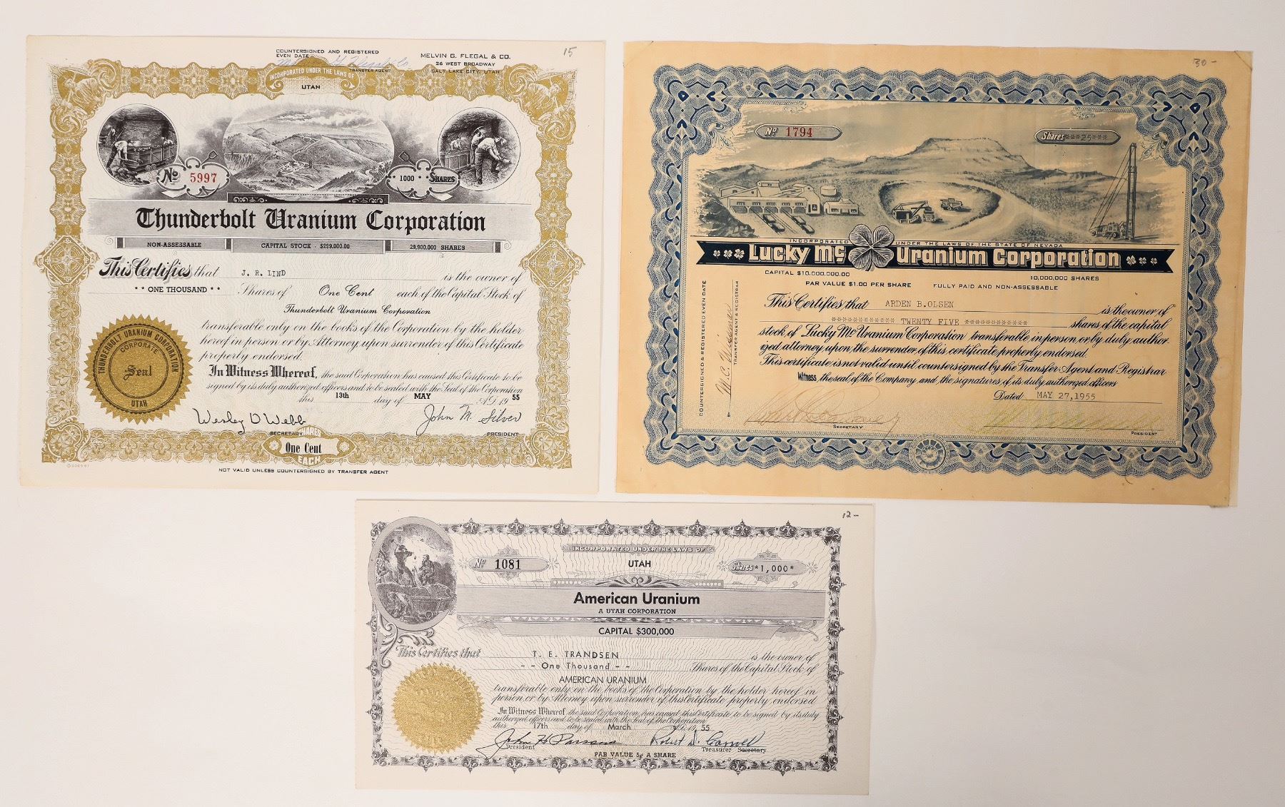 All issued during the Uranium Boom in 1955. Lucky Mc Uranium, American Uranium, Thunderbolt Uranium. All with mining vignettes.[