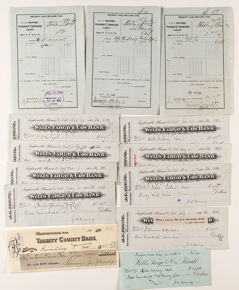 Thirteen checks and receipts for (embossed) Western whiskey merchants. The date range is about 1902-1910. Most items are Wells, Fargo &Co. related. Whiskey merchants include: Hall, Luhrs; Adams Booth Co.; Tillman & Bendel; Kirk, Geary & Co.; Lindley; Goldberg, Bowen & Co. City: State: California Inventory Number: 39530