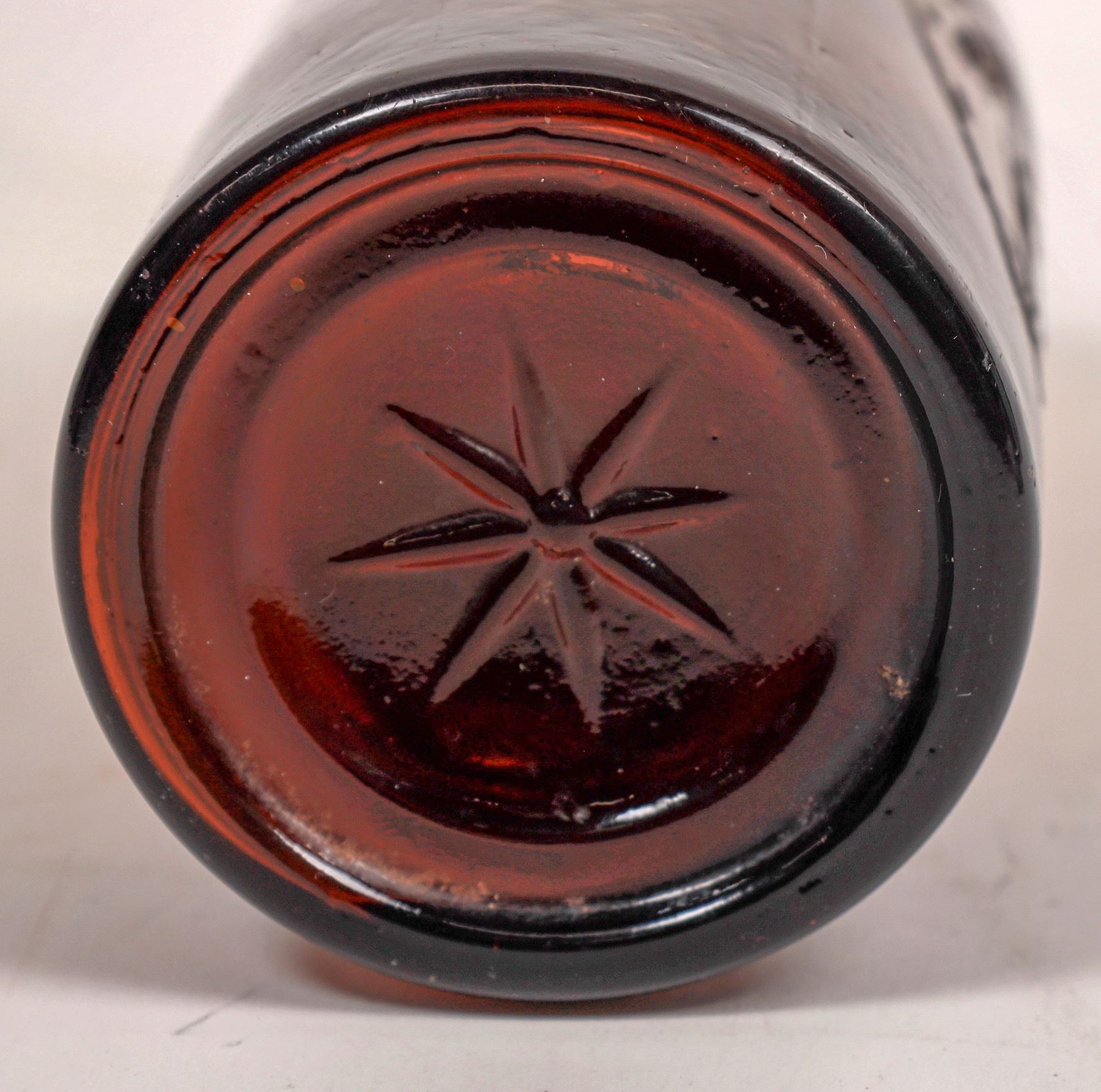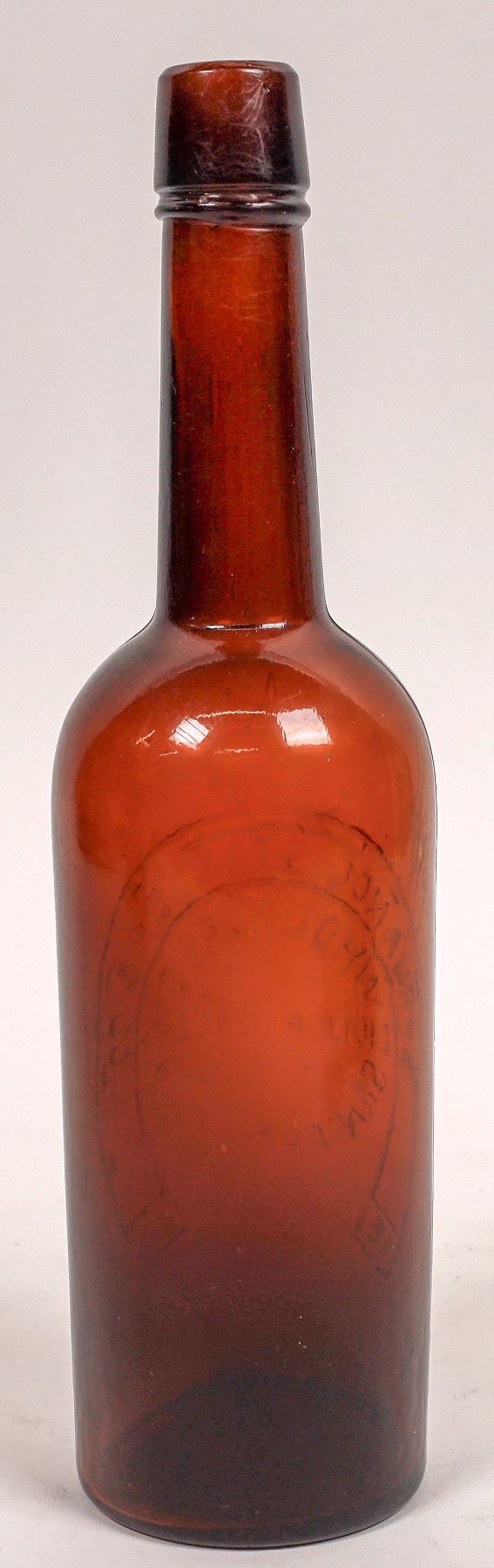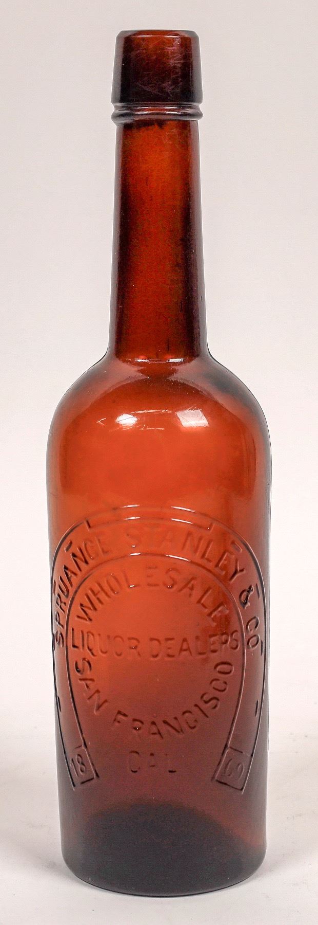 Embossed in a horseshoe, on the front of the bottle is : Spruance Stanley & Co ( au) / Wholesale ( au) / Liquor Dealers/ San Francisco ( ad) / Cal.// Base Embossed : With a 8 pointed star. 11 3/4" Tall , long tapered collar with ring, applied top. Fairly clean and shiny, but has a number of minute fine line scratches on the body, here and there. But, no form of major damage. If tumbled, would clean and polish to perfect condition. Ex: Fred Holabird Collection