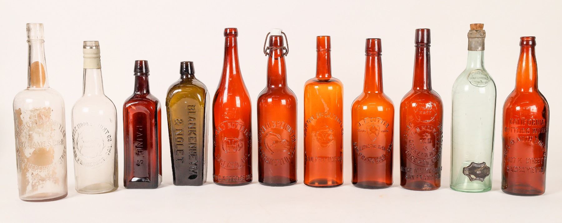 11 Western whisky and beer bottles. Amber and clear Jesse Moore fifth, aqua blob seal C Carpy rare paper label wine, amber J F Cutter fifth, Blankenheym & Nolet gin fifth, amber California Bottling Works crown top, clear Belmont fifth with partial paper label, amber Paine's Celery Tonic, amber Oakland Bottling, amber swingtop Buffalo Brewing, amber Cartan McCarthy fifth. No apparent chips or cracks.