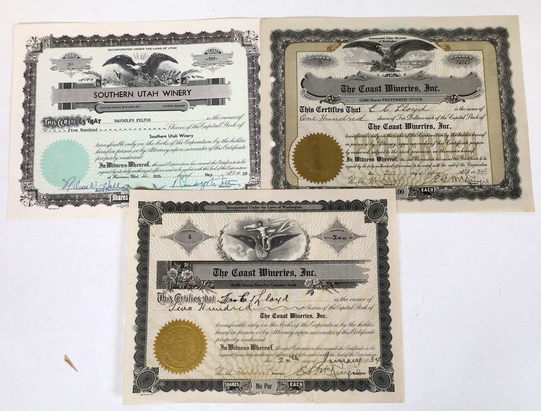 Three stock certificates issued by two winery companies in the western region of the country. Included are two from The Coast Wineries, Inc. one issued 1/20/1034 and canceled 8/3/1934 and the second one issued 1/20/1934 and canceled 8/3/1934. The third cert is issued by Southern Utah Winery, issued 5/8/1959, with no cancel date. All three are in good condition. Please see photos for more detail and condition.