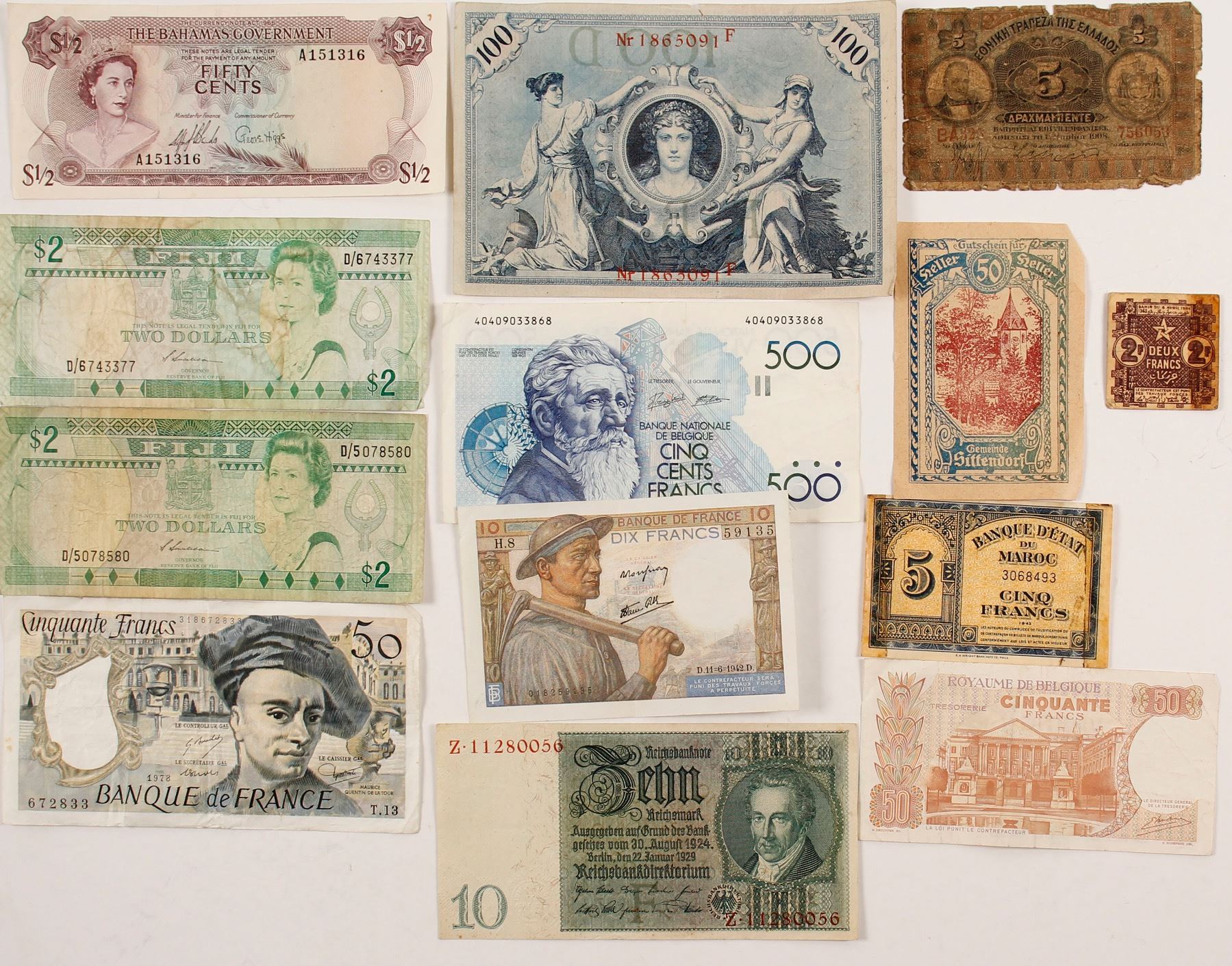 Generally post-WW1 Notes from the Bahamas (50c 1965), Fiji ($2), France 50f, 1978), Morocco (2F, 5F-1943), Germany (100m, 1908; 10m, 1929, AU; 50 sneller), Belgium (50f, 500f), Greece (5, 1908, poor). Date: City: State: foreign HWAC# 75564