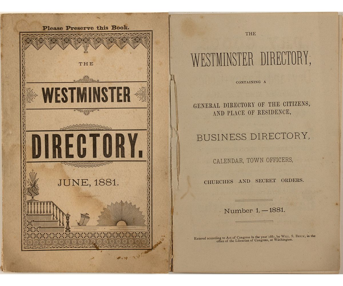 Very scarce. No listings found on OCLC. "Containing a General Directory of the Citizens and Place of Residence, Business Directory, Calendar, Town Officers, Churches and Secret Orders." Number 1.--June, 1881. By Will. S. Brick. 48 pages. Stiff wraps. No index. Condition: Soiling and foxing. Tear forming at binding, but everything is intact. Measures 4 1/2" x 6 3/4" Rarity: [i]City: County: State: MADate: