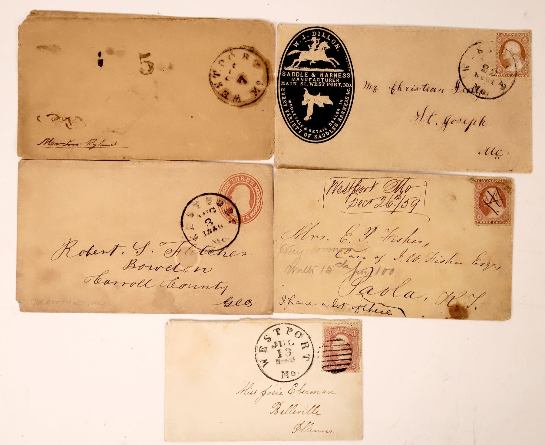 1) The oldest is a stampless envelope (pre1855) PAID 5. 2) 1859 Westport manuscript. December 26. Manuscript cancel. Sent to Mrs. Fisher of Paola. K. T. 3) 1864. Strong strike with oval bar grid. 4) 188-. 5) Great corner advertising in deep blue for WJ Dillon, Saddle and Harness manufacturer, Main Street, West Port, Mo. (1832-1902.) Also wholesale & retail dealer in every variety of saddles, harness, etc. 1858!