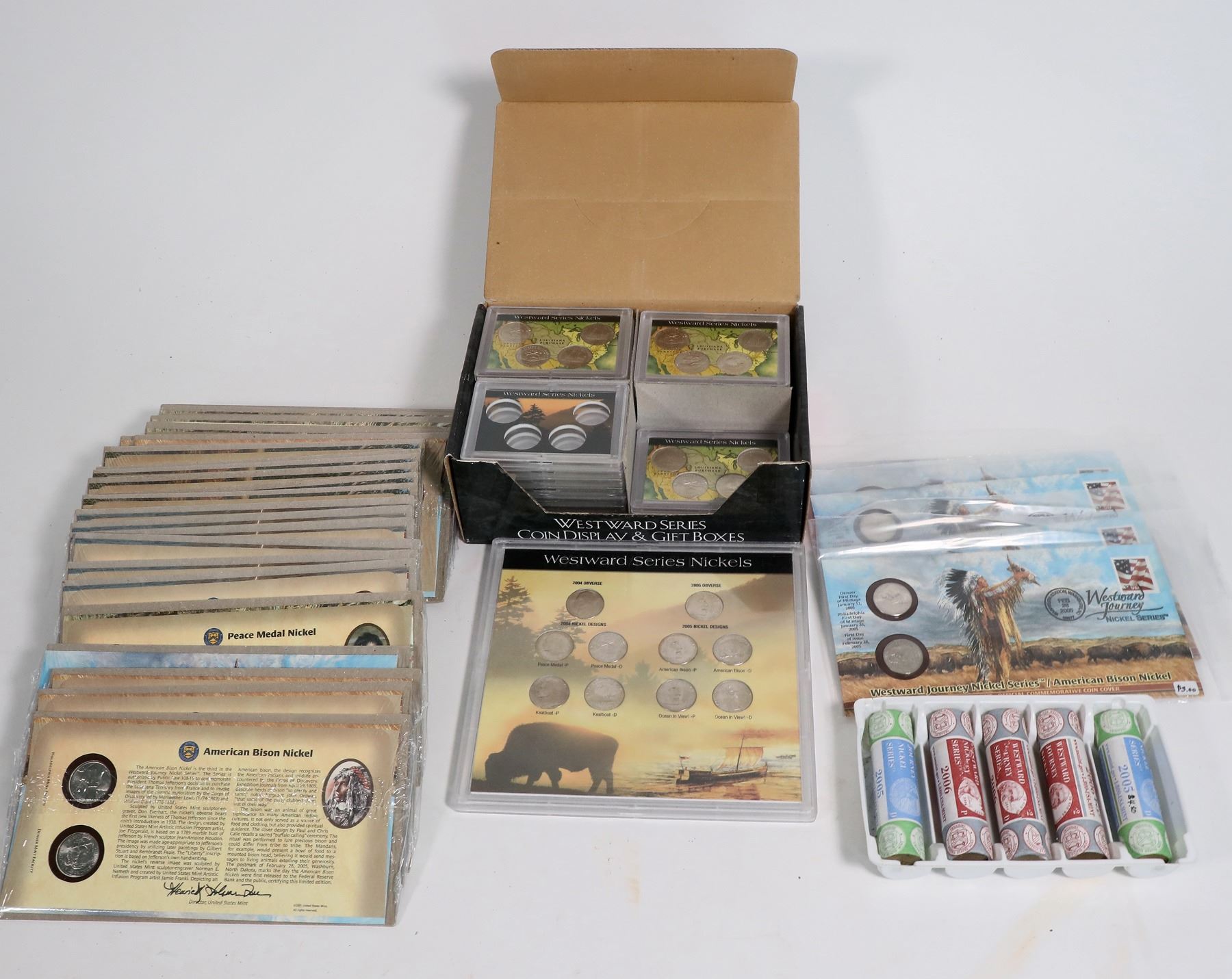 In 2004 and 2005, the Jefferson nickel featured four different designs to commemorate the bicentennials of the Louisiana Purchase and the Lewis and Clark expedition. The images were evocative of the historic expedition into the Louisiana Territory. This lot includes: a Whitman publishing ten coin plastic case featuring all four nickels ( 7 x 7 inches); a carton of coin display & gift boxes: 3 1/2 x 2 1/2 plastic cases to hold the four nickels. 19 have all four nickels; 11 are empty cases, and one has one nickel. Five original BU rolls: 2005 (2) & 2006 (3). U. S. Mint official commemorative coin covers (4 1/2 x 7 1/2 inches with two coins each): American Bison Nickel (11); Ocean in View (6); Keelboat Nickel (6); Peace Medal nickel (6).