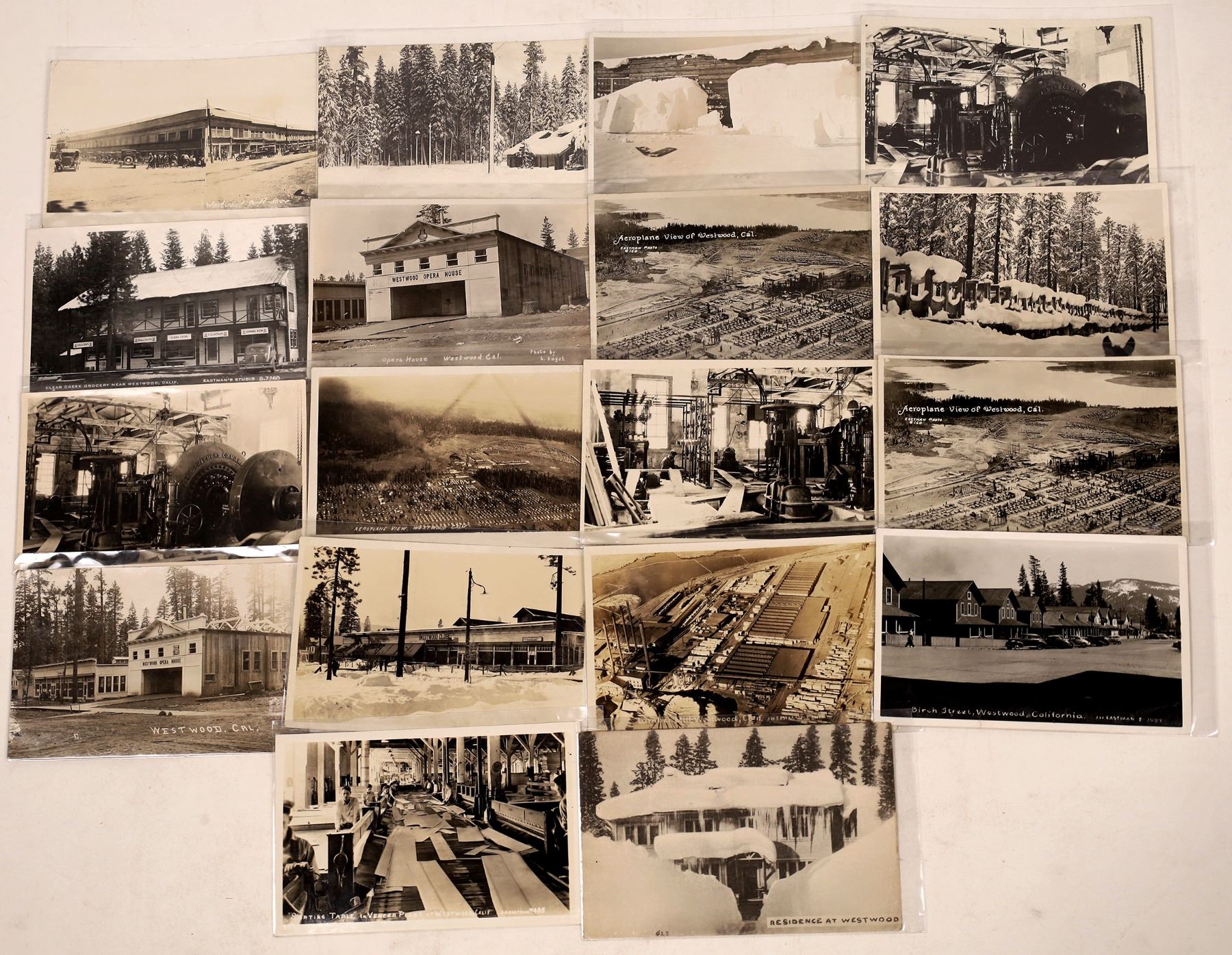 Lot of 18 black and white real photo postcards of Westwood, California. Westwood Opera House, Aeroplane Views; Westwood Department Store; power plant views with explanations on the reverse; snow scenes.