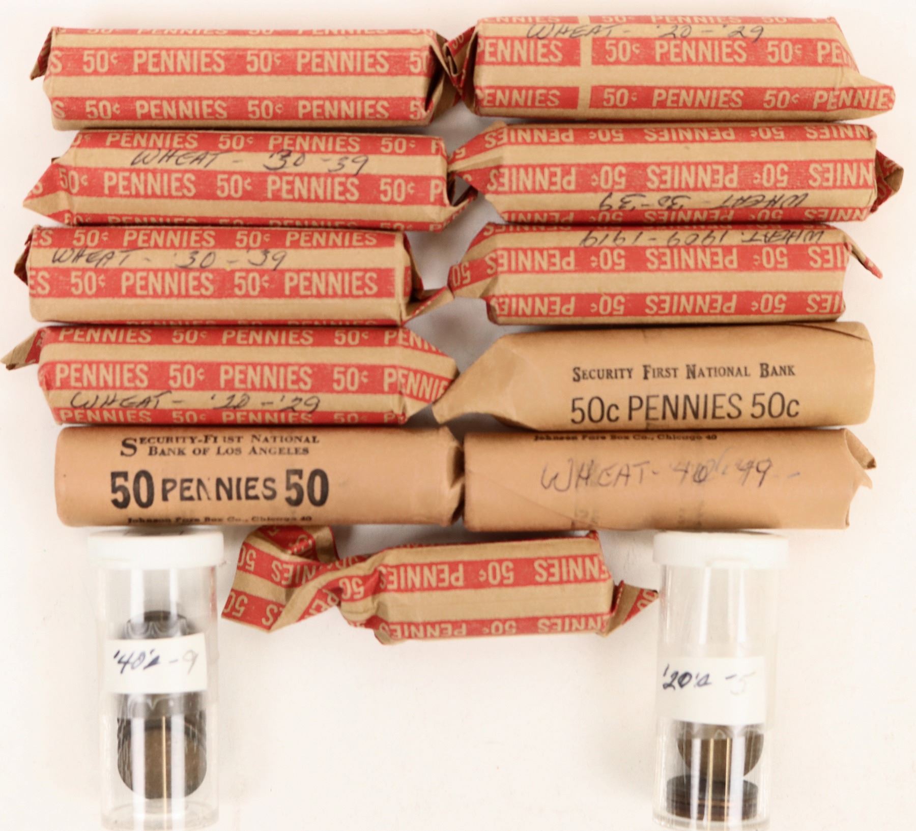 Nine rolls of circulated wheat back Lincoln cents: one roll 1909-1919; one roll 1920-29; four rolls 1930s; one roll 1940s; two rolls 1950s. Also about a hundred additional cents.
