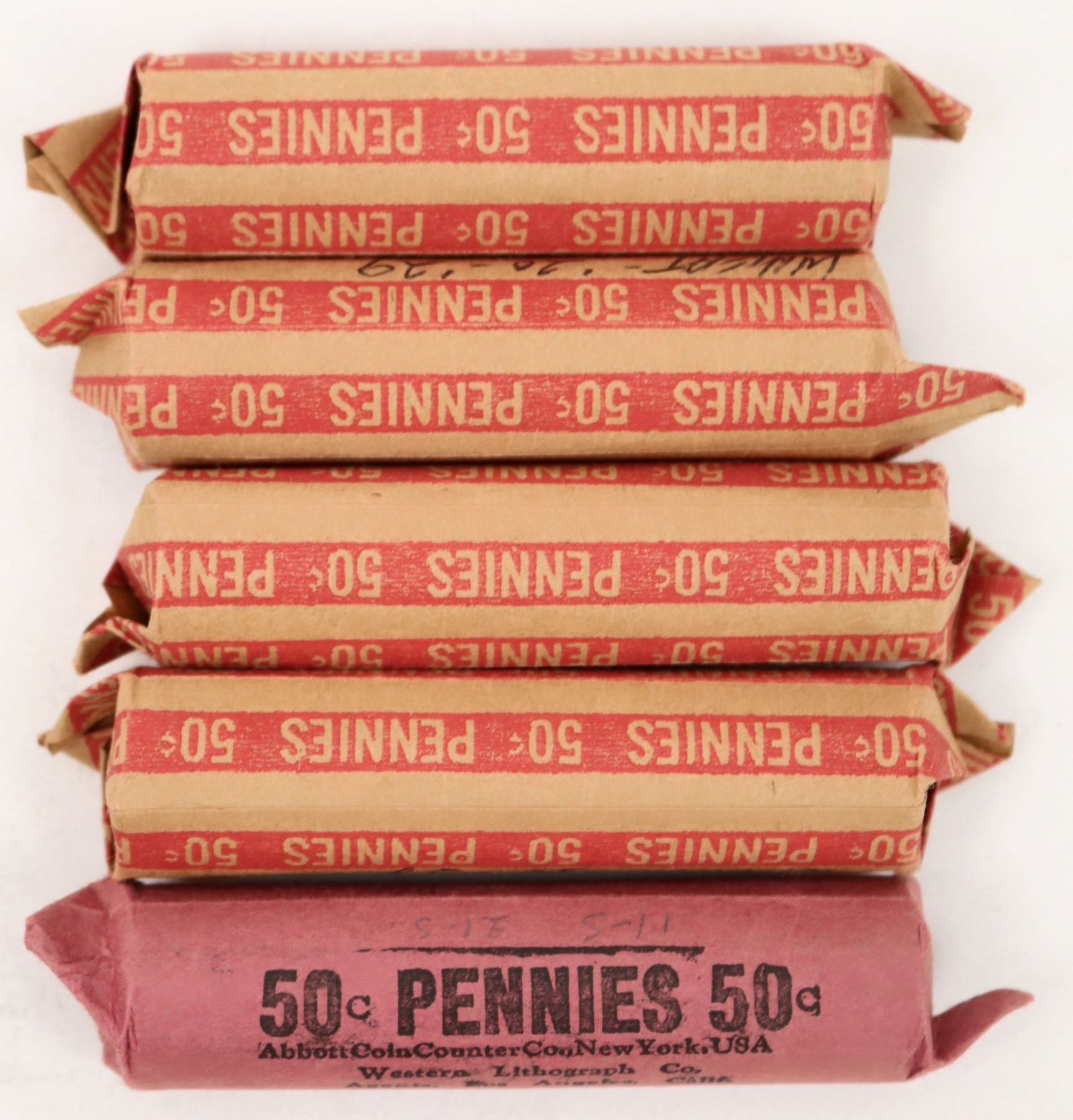 Wheatback Lincoln cents were issued from 1909 until 1958. This lot is five rolls of circulated cents, a roll for each decade. 250 pennies. Fill those coin albums!